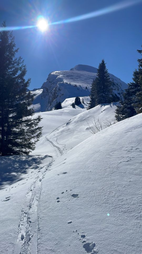 Unten relativ wenig Schnee und sehr verfahren, am Forstweg müssen Ski 300m getragen werden. Am Kamm Richtung Steilstufe herrlicher Pulver, oben typisch verblasen.