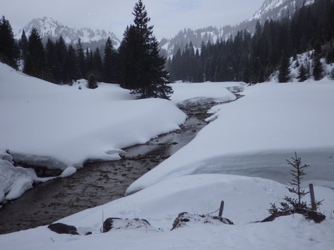 Start auf PP Menig-Grund bei +4 Grad und leichtem Schneefall. Die Route ist durchgehend eingeschneit. Ein Schäumchen Neuschnee auf der Altschneeunterlage, welche manchmal tragend, manchmal gedeckelt war. Wolken und Sonne wechselten sich ab. Abfahrt zunächst auf tragender Unterlage, dann mehr und mehr Übergang zu Nassschnee. Der Altschneedeckel war inzwischen gut fahrbar aufgeweicht. Nur einen Tourengänger im Aufstieg im Chäli gesichtet.