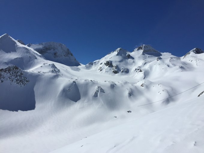 In der nordseitigen Abfahrt findet sich zum Teil noch schöner Pulverschnee auf einer tragenden Unterlage. Der südseitige Aufstieg auf das Rottällihorn von der Rotondohütte ist tragend harschig, Gipfel und Grat sind abgeblasen.