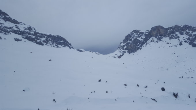 Zum Start in Rüti noch kurze Zeit sonnig, dann mit zusammenbrechendem Föhn sehr schnell starke und dichte Bewölkung bei wenig Sicht. Spuren im starkem Wind ab der Alp Carschina schnell verblasen.