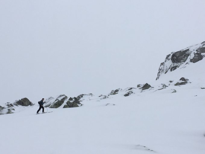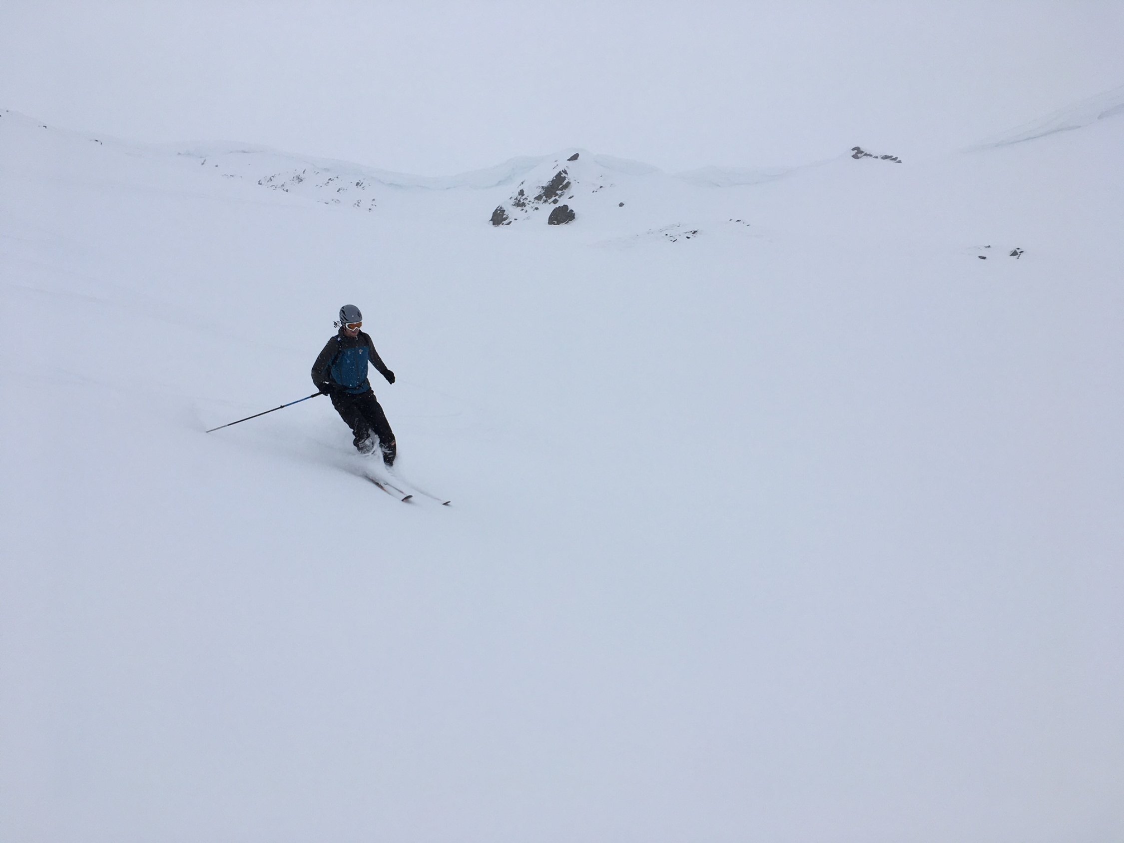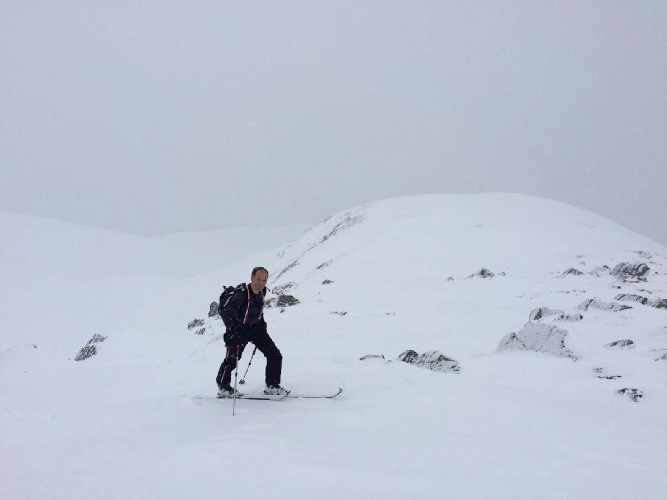 Mann kann noch knapp von Mutschnengia 1405m mit Ski Aufsteigen. Tour heute bei graues Wetter und einsetzender, leichter Schneefall. Kein Wind. Aufstieg Alles immer den NE-Grat nach, ein bisschen steinig. Abfahrt durchs Tal Puzzetta/Fontaunas mit recht guter, pulvriger Schnee.