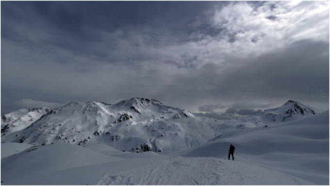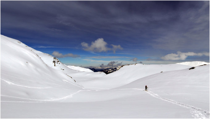 Überraschend gute Bedingungen, Schneedecke von unten bis oben optimal verfestigt und tragfähig, sogar für Fußgänger. Ab etwa Hütte geringe Pulverauflage, nach oben hin ca. 10cm. ebenfalls auf total festem Untergrund. Bis etwa 2100m mollig warm dann zusehends Bewölkung und Nebel aus SO. Auf dem Gipfel teiweise dichter Nebel, bei der Abfahrt schlechte Sicht, deshalb hielt sich das Fahrvergnügen in Grenzen. Bei besserer Sicht sehr gute Bedingungen zum Skifahren. Das zeigte sich auch bei der Abfahrt von der Hütte, auch im lichten Wald gut verfestigte Schneedecke und jede Menge Fahrspass.