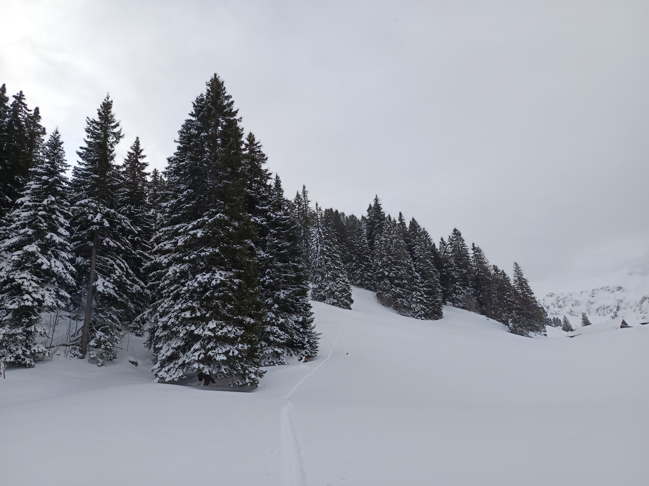 Früh gestartet und noch unverspurt, bis auf eine Abfahrtsspur