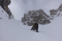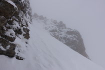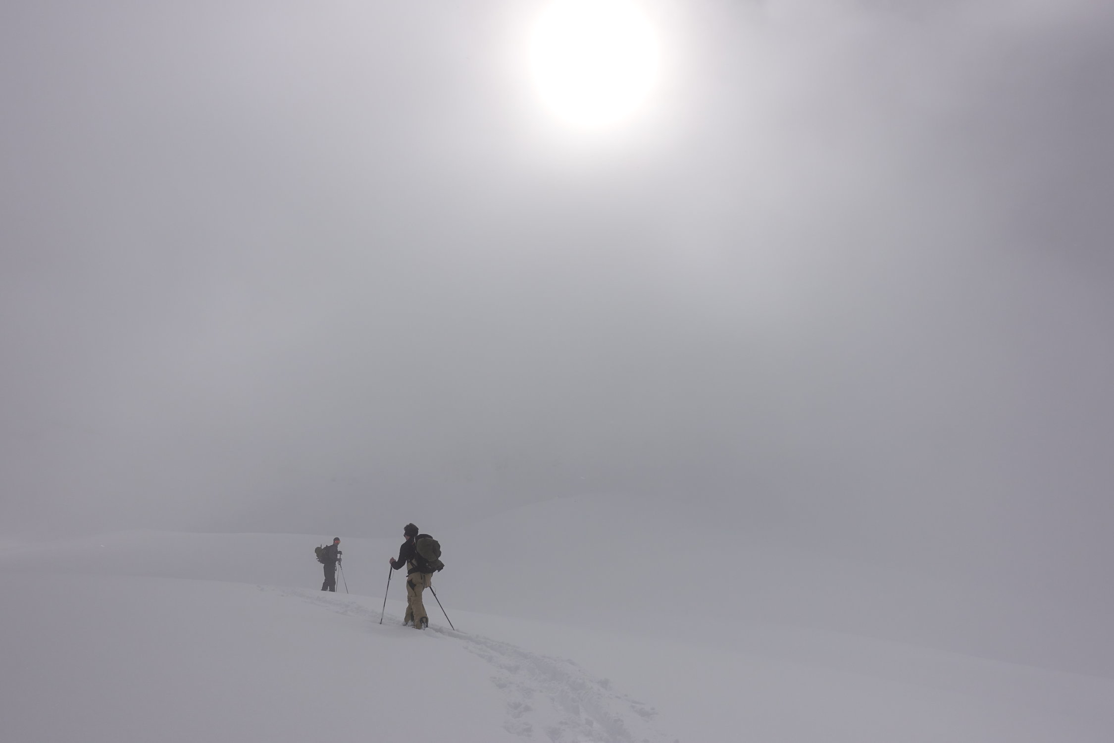 Sicht leider kaum vorhanden. Schnee dafür schön und viel, gerade im oberen Teil um 35cm. Unten um 2200m spürt man den Untergrund. Schneerinne zum Gipfel Südseite gespurt und gut zu begehen. Steigeisen bringen bei diesem weichen gemisch aus filzigem Schnee und unten nass wenig. Kette liegt unter viel Schnee. Es war kühl aber nicht kalt. Kaum Wind, dennoch Triebschnee ansammlung zum Teil vorhanden.