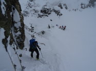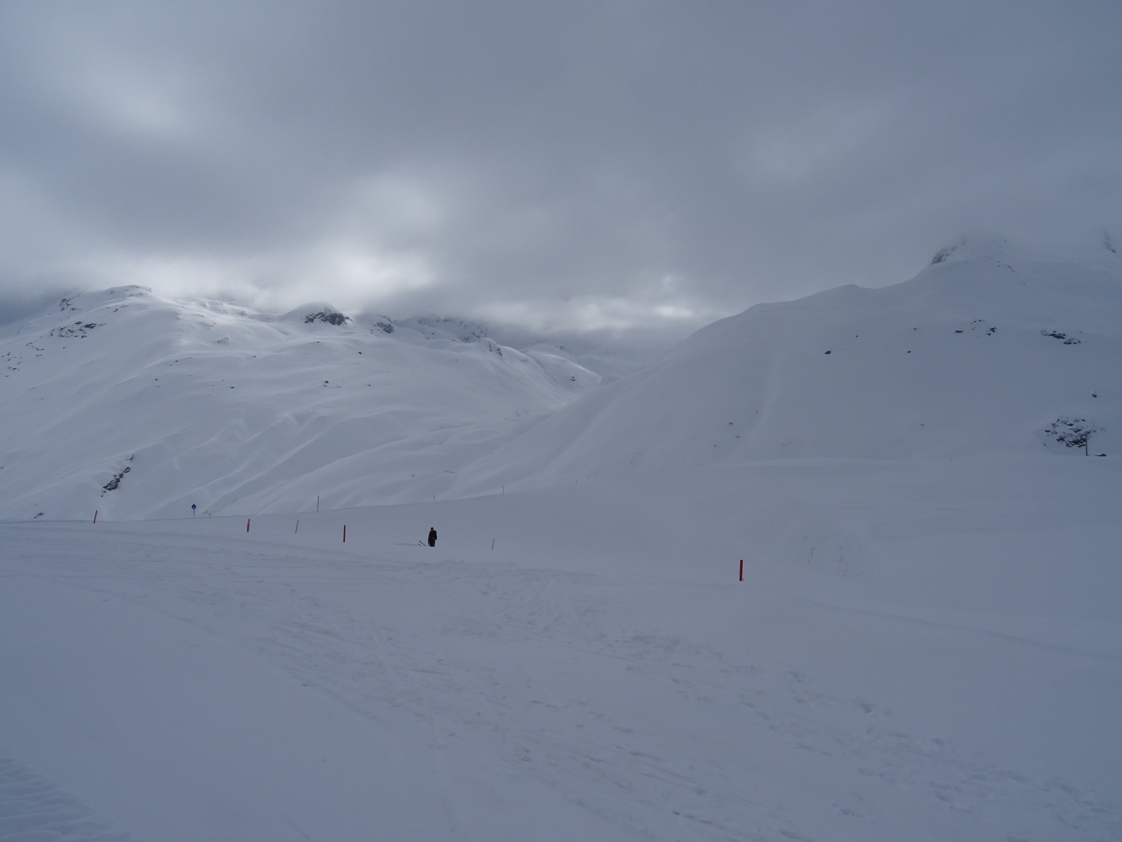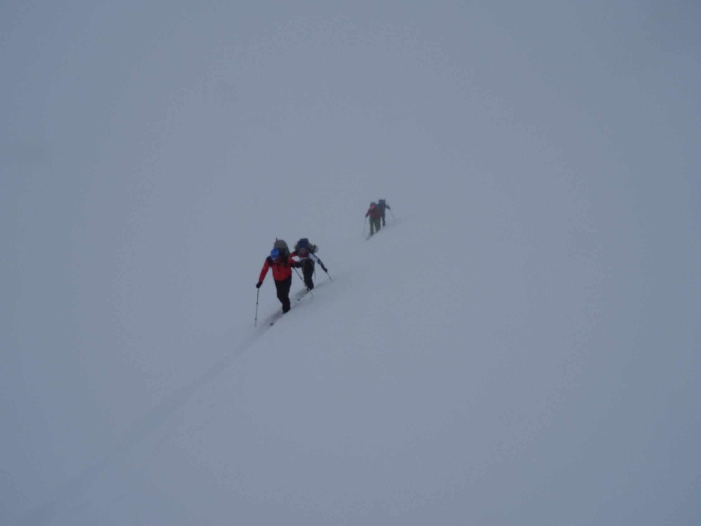 Top-Pulver Schnee auf der gesamten Route, jedoch ab dem Talschluss wenig bis null Sicht (white-out); an der Scharte Skidepot; dann die ersten 50m durch linksseitige Umgehung des ersten Turmes noch gemacht, dann aber zu viel Neuschnee am Grat, daher zu gefährlich und umgekehrt; Abfahrt super Pulver, aber aufgrund white-out Gestochere bis zur Wiesbadener Hütte;