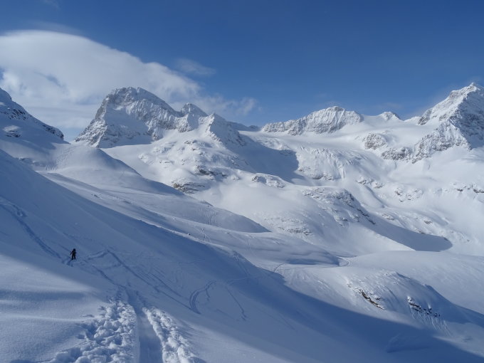heute ab halb 9 bestes Tourenwetter! und top-Pulverschnee (weitgehend noch unberührt); Aufstieg zur Haagspitze von Norden vertretbar, sehr schöne Abfahrt! Abfahrt zurück zur Bielerhöhe;