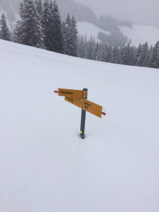 Start um 09:10 bei -1.5C.. also deutlich wärmer als gemäss Prognossen. Wetter zu diesem Zeitpunkt recht „freundlich“. In der Region St. Stephan bis ca. 1300 aper, danach geschlossene Schneedecke. Noch viel Schnee ab dieser Höhe. Im unteren Teil ca. 10cm Neuschnee auf feuchter Unterlage. Mit der Höhe bis ca. 30cm zunehmend. Der Neuschnee liegt auf einer harten/glatten Unterschicht welche mit dem Neuschnee noch sehr schlecht verbunden ist, daher war aus unsere Sicht das SLF Bulletin Stufe 2 für diese Region zu tief.
