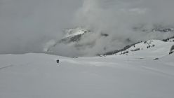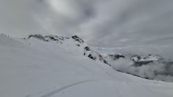 Schneeverhältnisse: ca. 10–15 cm Pulver auf harter Unterlage. Steine sind teils neckisch eingeschneit, mit etwas Fingerspitzengefühl jedoch gut fahrbar und ohne Steinkontakt machbar.