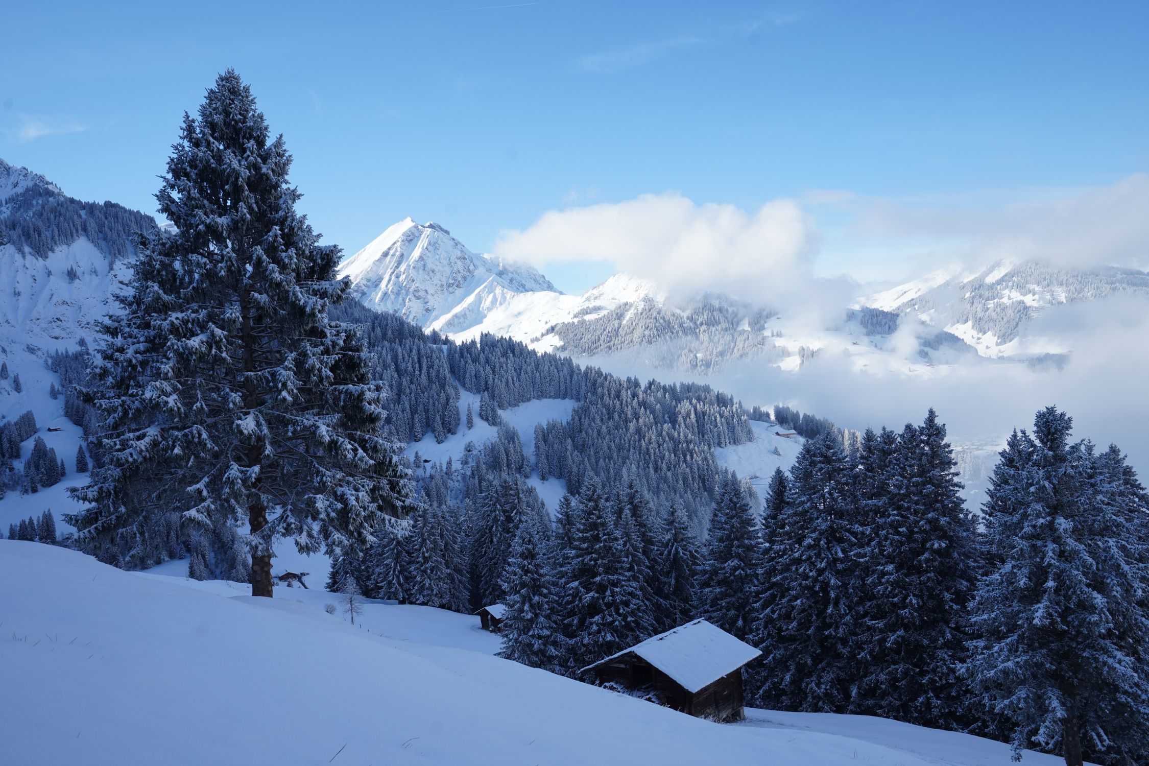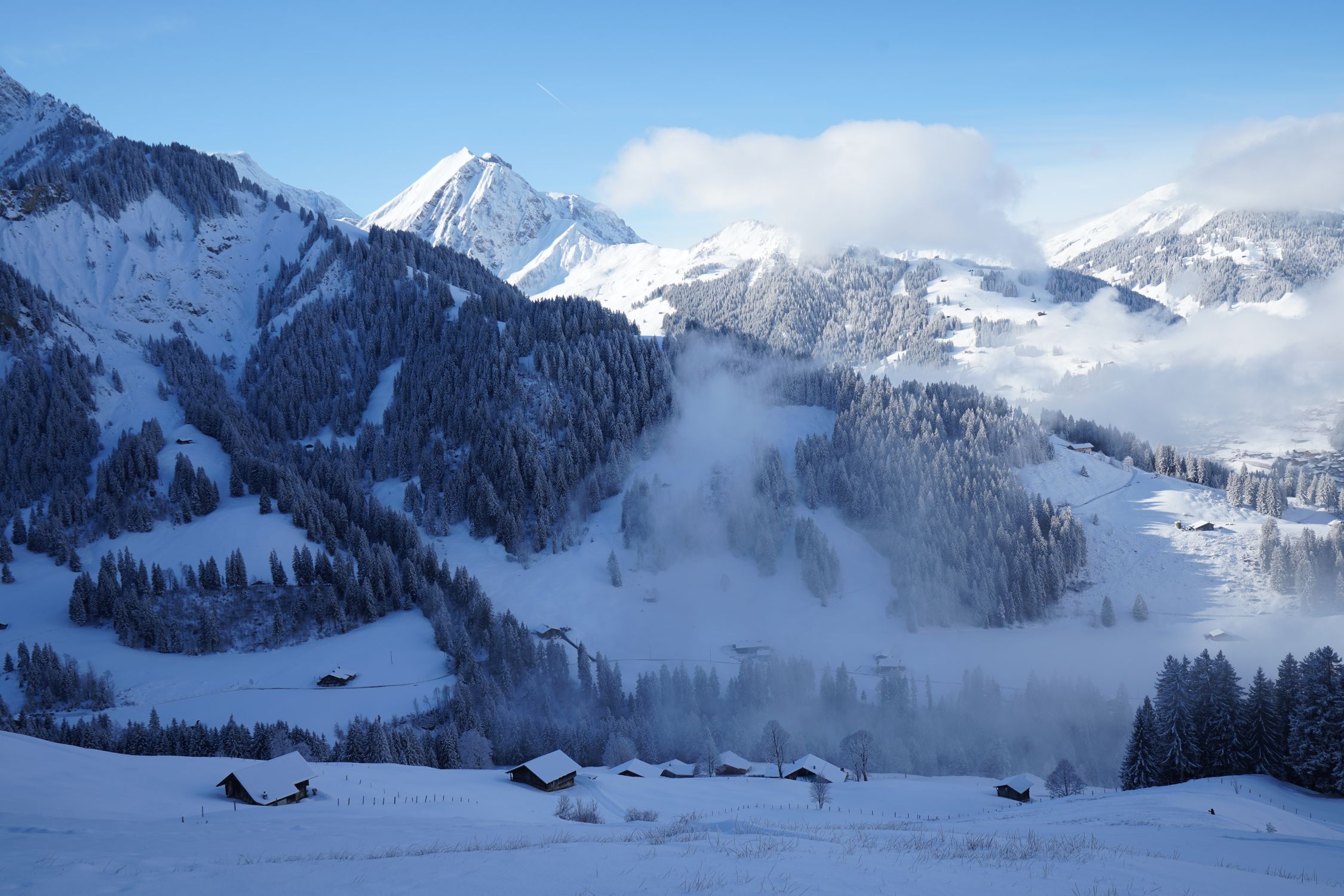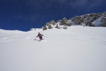 In der Abfahrt sehr schöner Pulver mit minimaler Kruste bis zur Bondalp. Wunderschön zum fahren. Von dort ist der Pulver etwas dichter. Ab 1650 m keine durchgehende Unterlage mehr, der neue Schnee liegt direkt auf dem Gras. Man kann aber bis ganz unten abfahren.