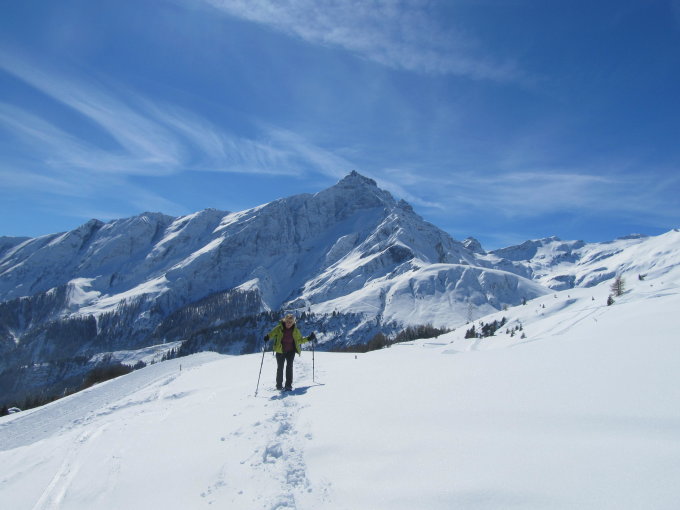 Ca. 5 bis 10 cm Neuschnee, am Morgen Pulver, rasch feucht werdend. Darunter tragende Altschneedecke. Neuschnee jedoch ohne Bindung zur Unterlage, was beim Abstieg in steilerem Gelände zu "Rutschpartien" führte. Angesichts der Verhältnisse eher WT3.