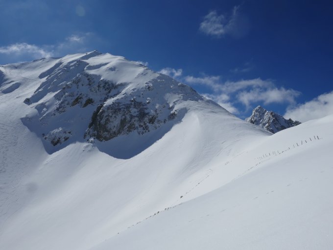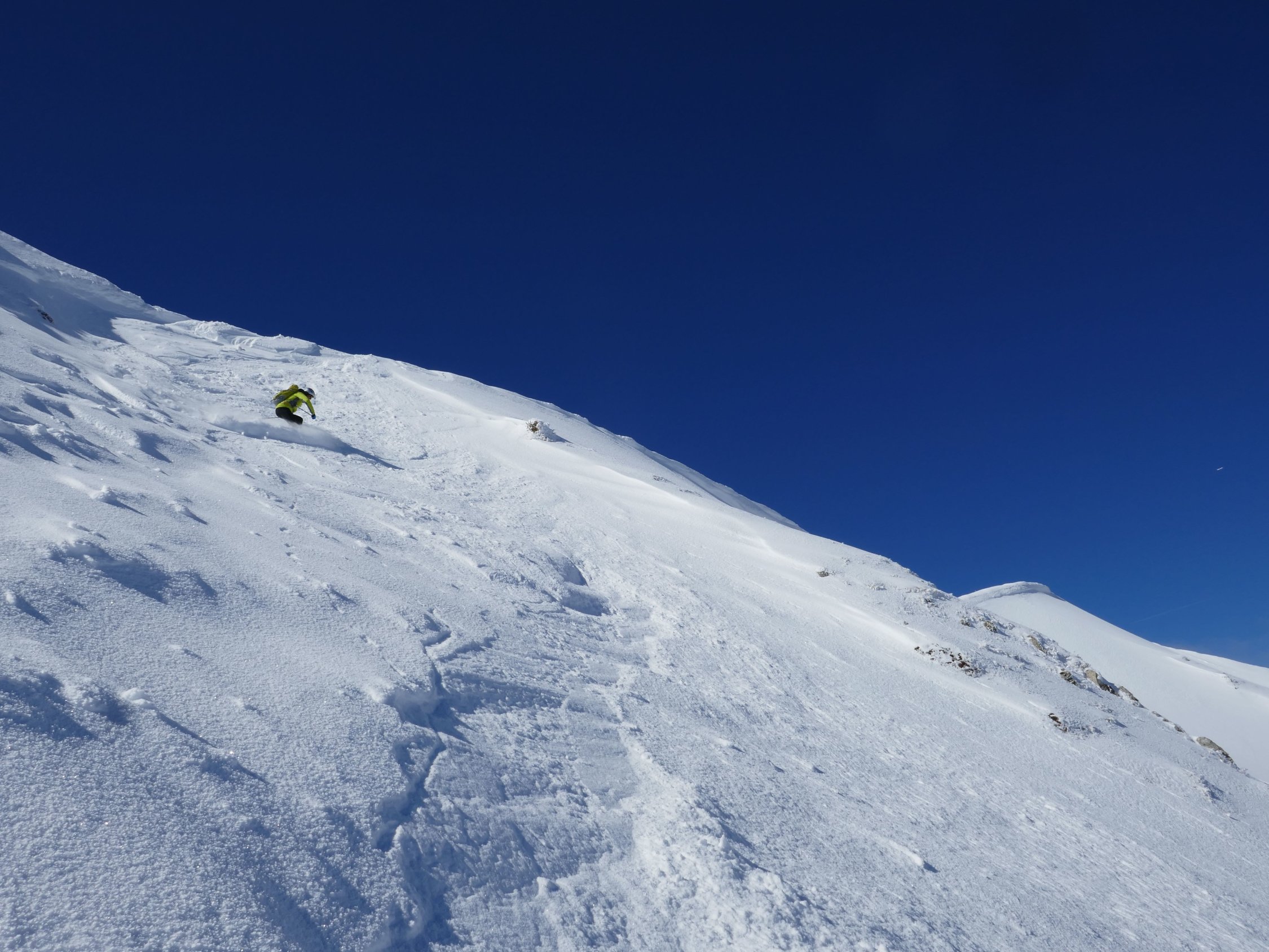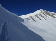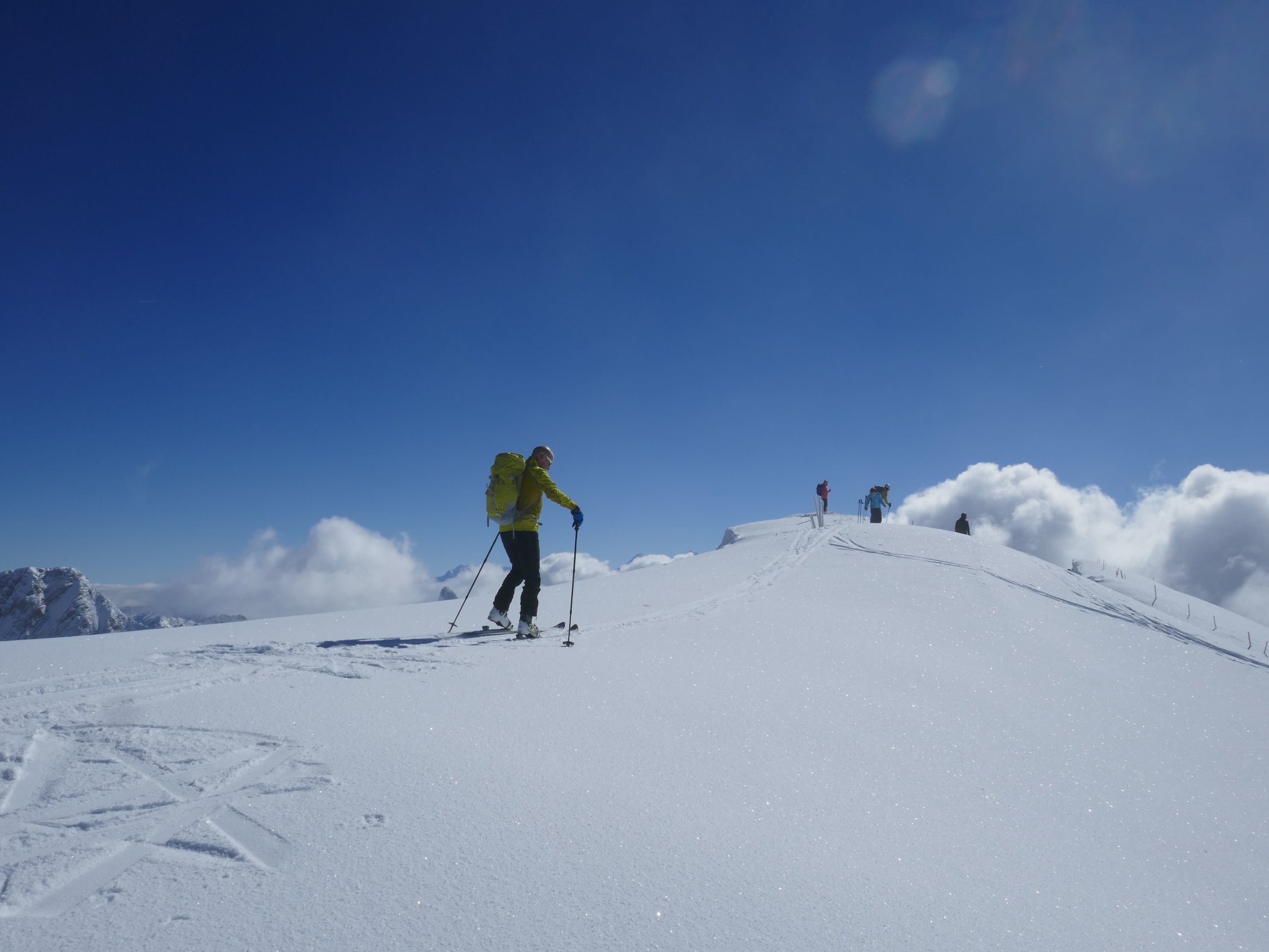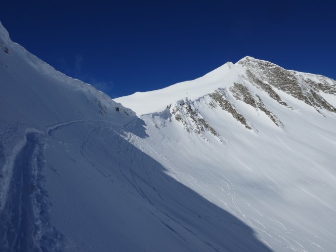 gute Verhältnisse Bürgle Aufstieg via Morgetenpass (gute Spur, grosse Wächten), Abfahrt Nordflanke und Aufstieg Bire (Pulverschnee)