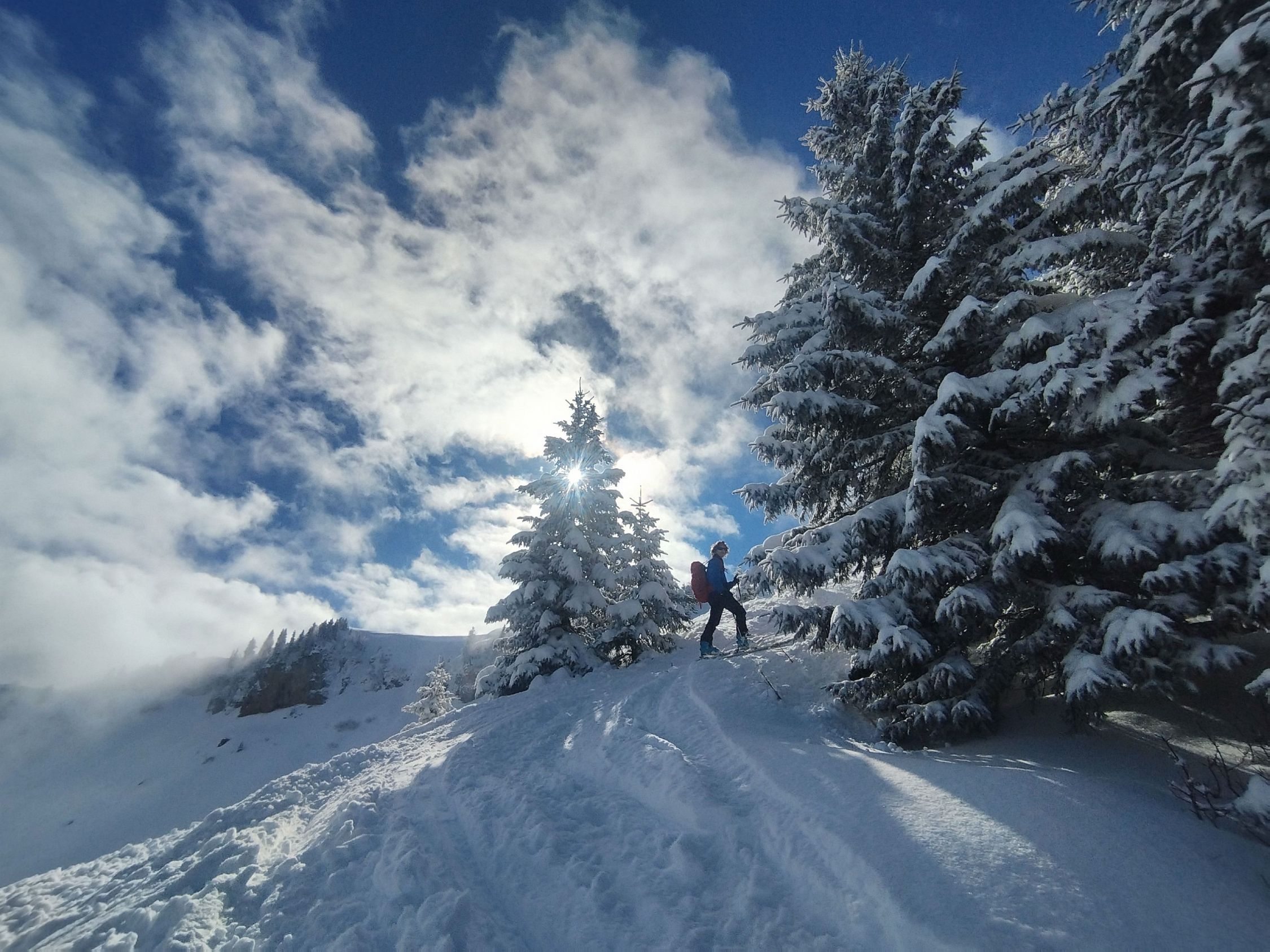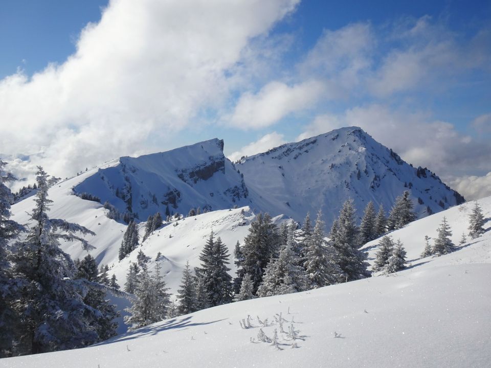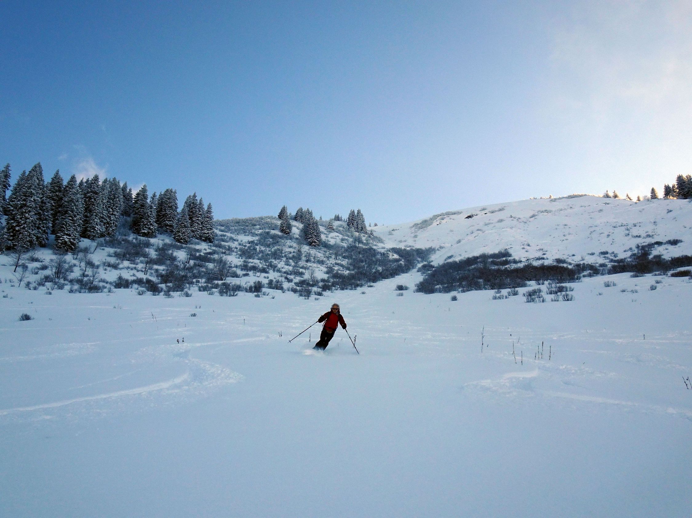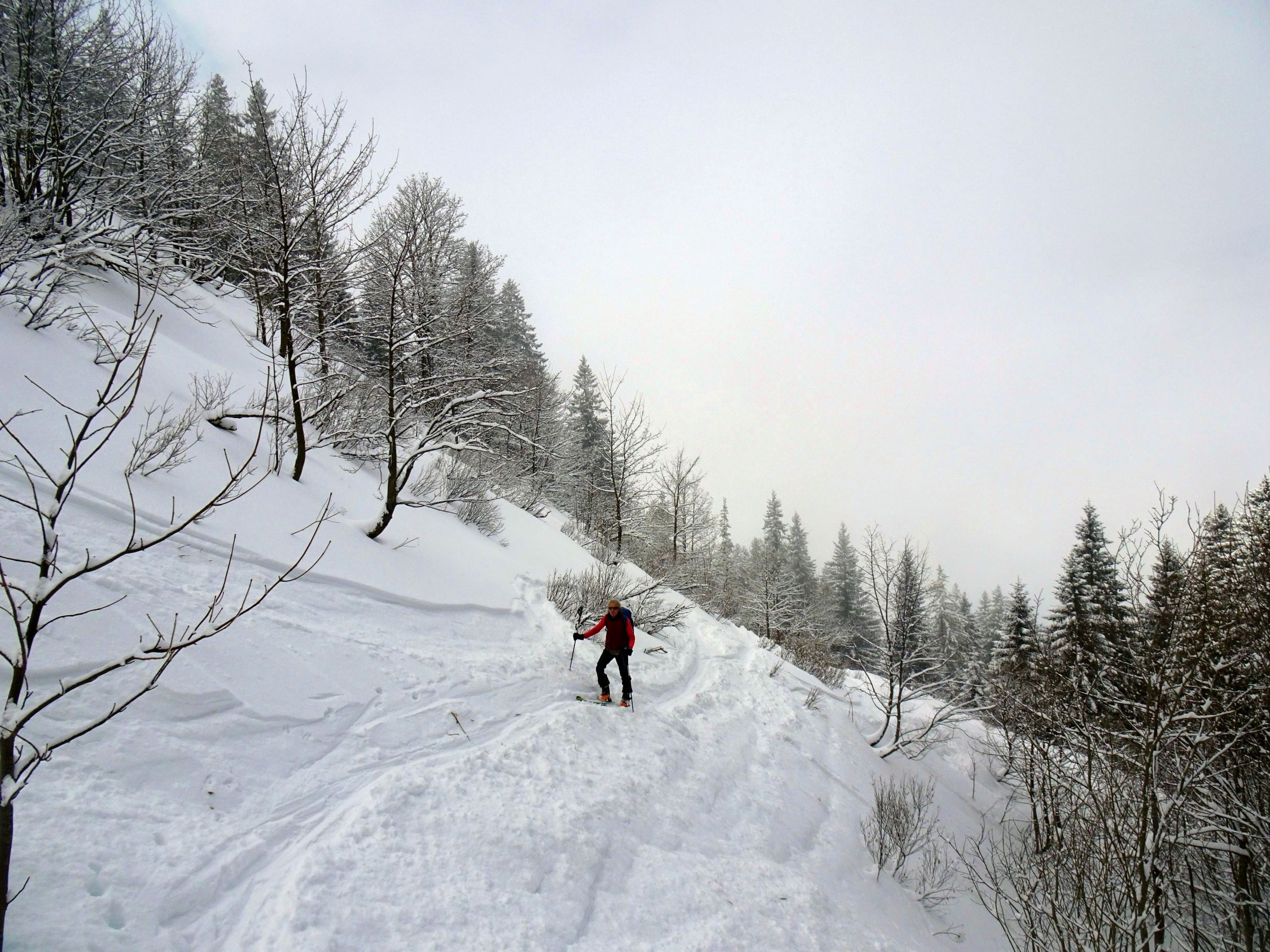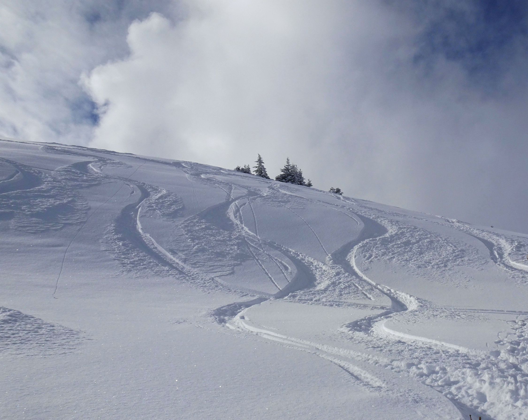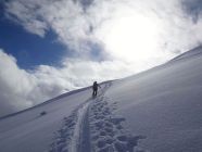 Abfahrt dann jedoch erstaunlich gut. Sind zuerst den schönen Nordosthang unterhalb des Gipfels abgefahren. Hier Traumpulver und viel Platz, nur bisschen kurz... Danach den großen Nordhang, in den wir aber erst nach der Steilstufe eingequert sind. Vor allem im unteren Teil sehr schön zu fahren, wo es etwas flacher wird. Wider Erwarten keinerlei Steinkontakt, auch die kurze Waldpassage ging recht gut.