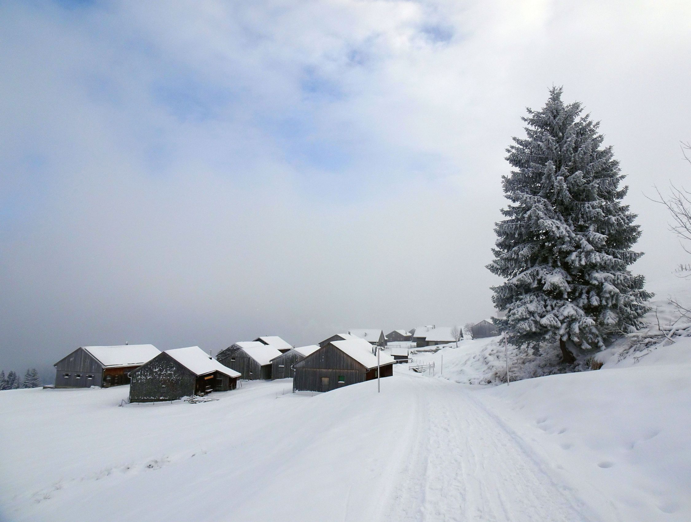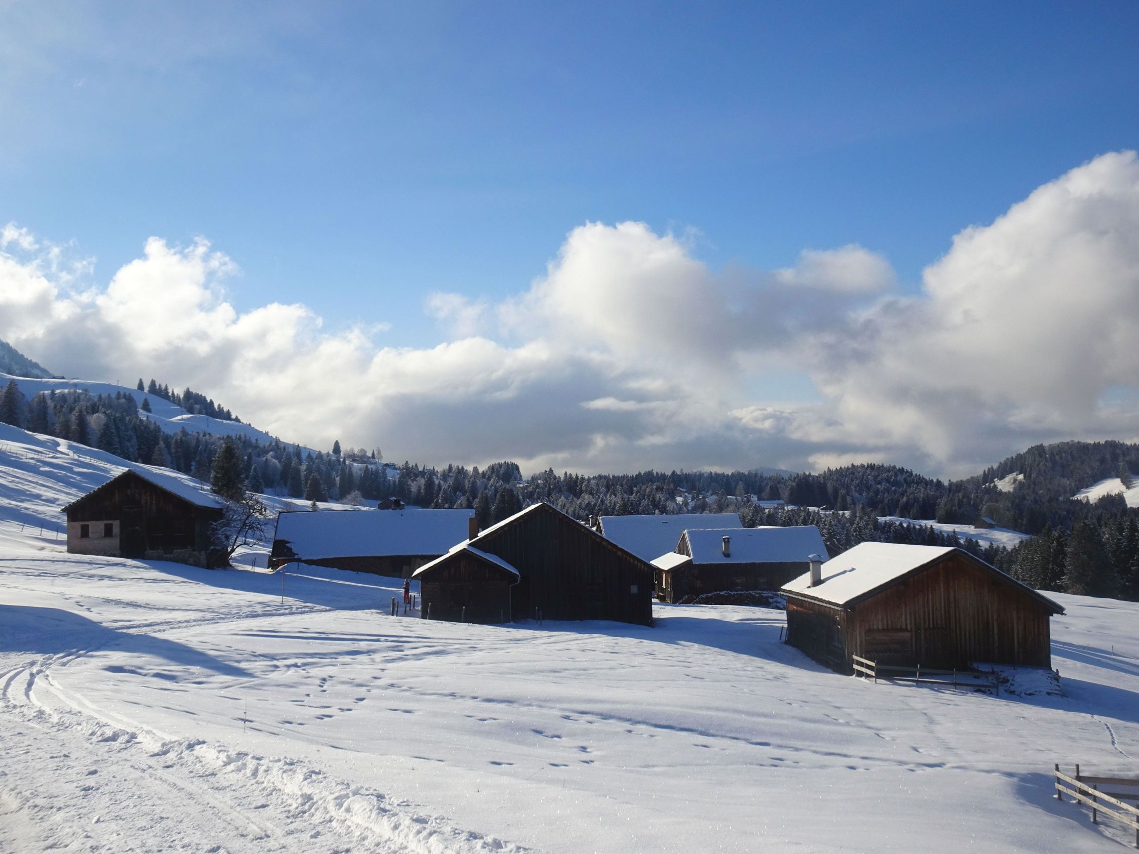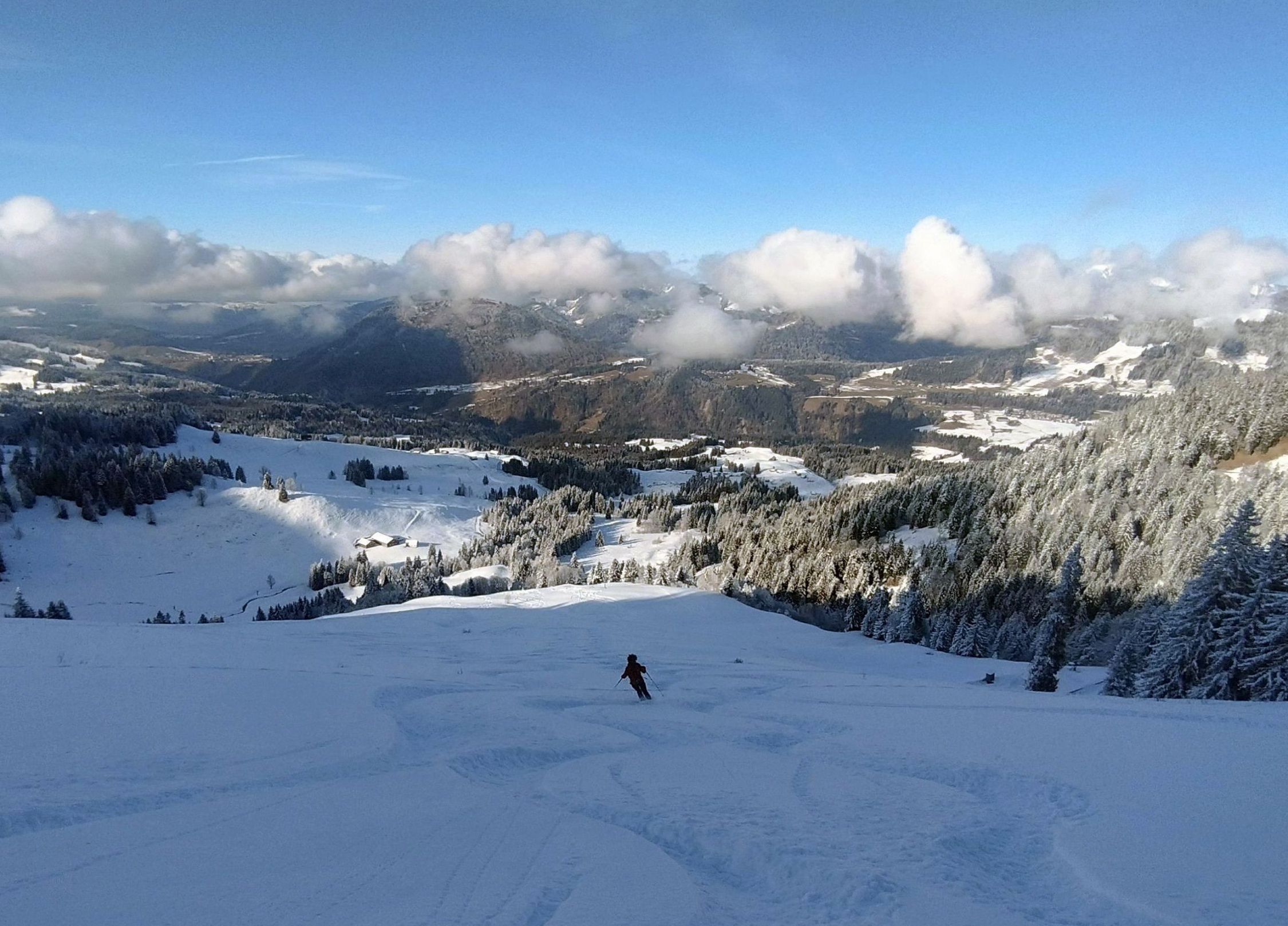 Nachdem sich am Gipfel zaghaft die Sonne zeigte, hatten wir dann für die Abfahrt auch gute Sicht. Der Alpweg talauswärts erfordert mit kurzen Gegenanstiegen nochmal etwas Doppelstockeinsatz, ist aber nicht sehr lang.