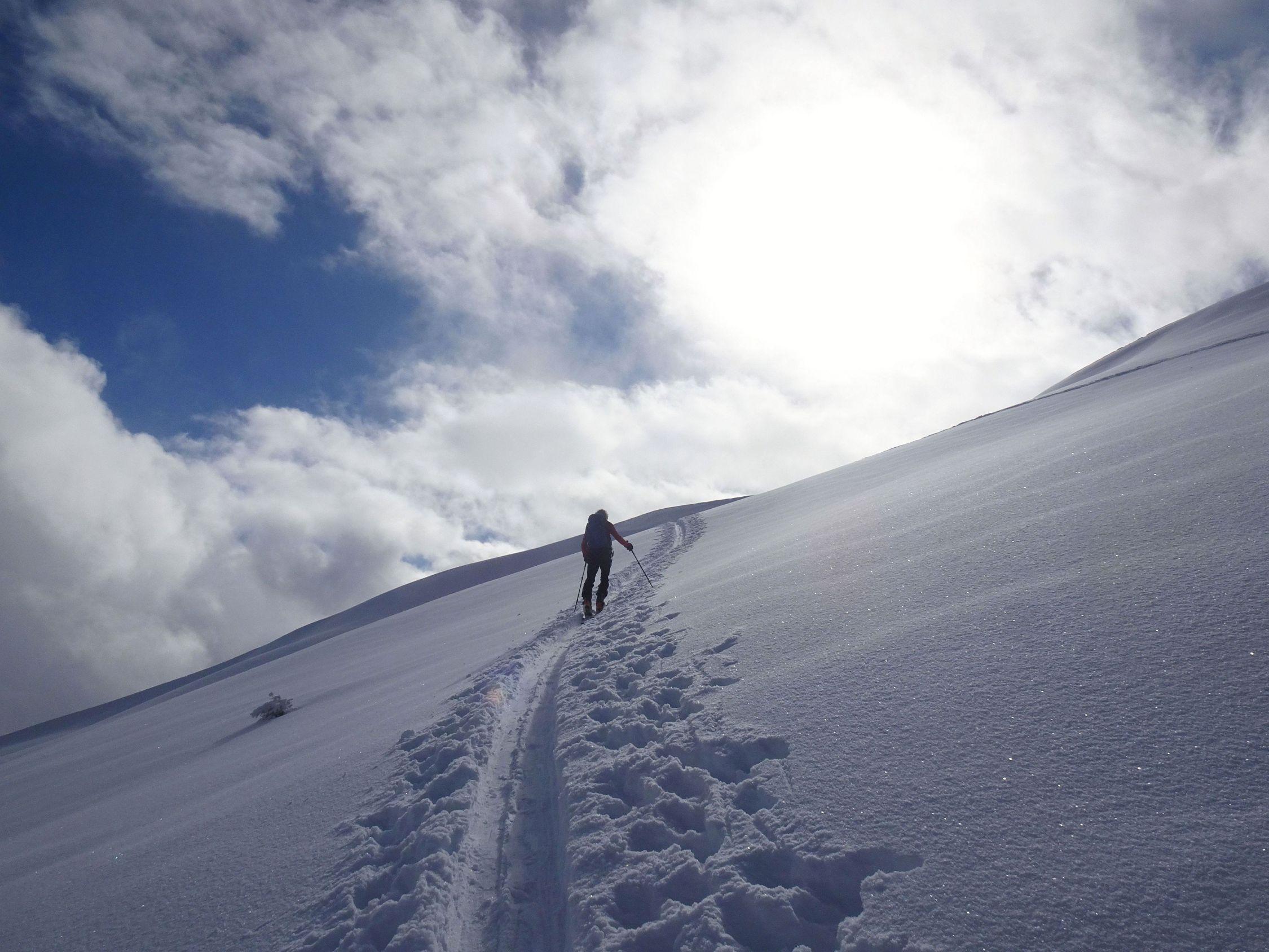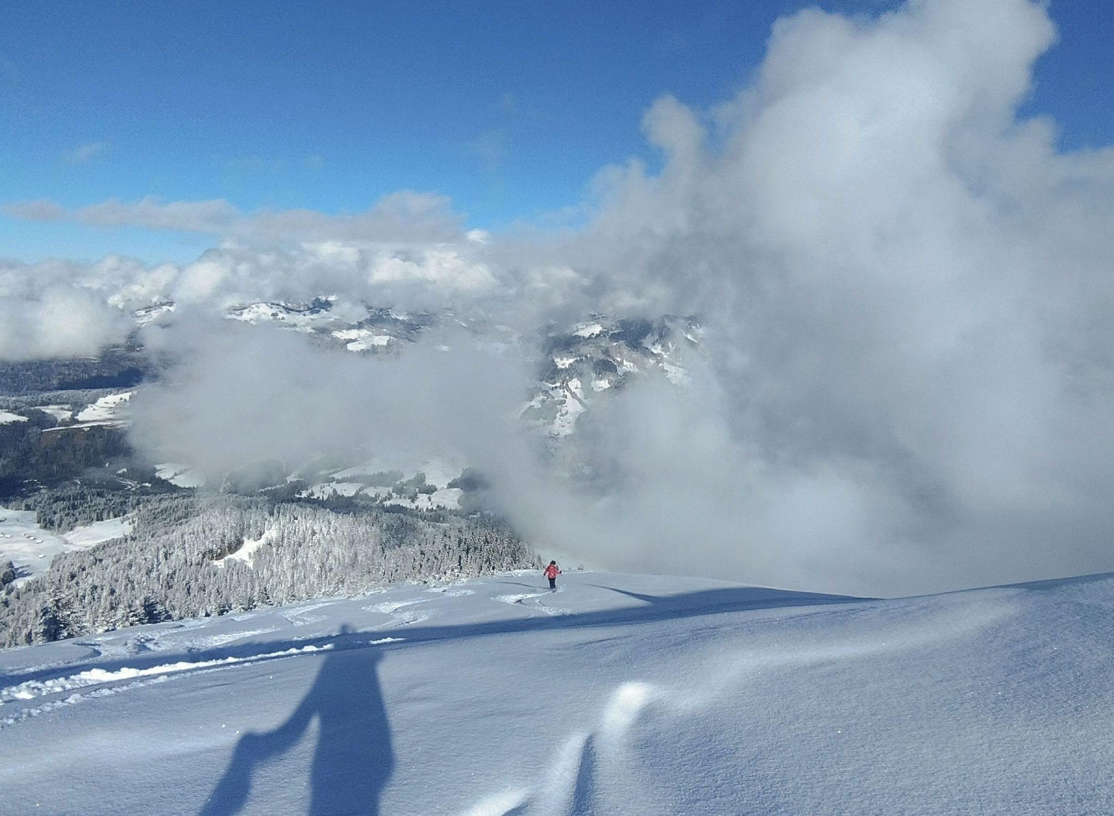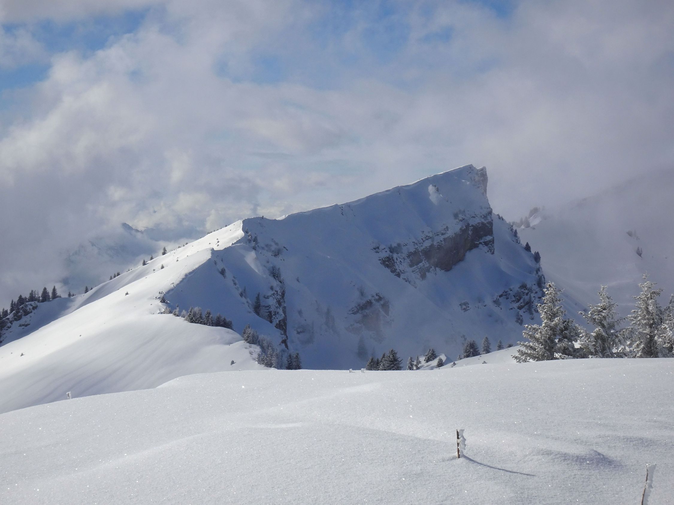 Wir hätten im Aufstieg nicht gedacht, dass die Tour heute noch sonderlich lohnend wird. Wolken und Nebel bis am frühen Nachmittag, dann erst langsam besser. Im unteren Teil eher wenig Schnee, oft schaut Gras raus und stellenweise wenig Grundlage.