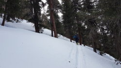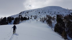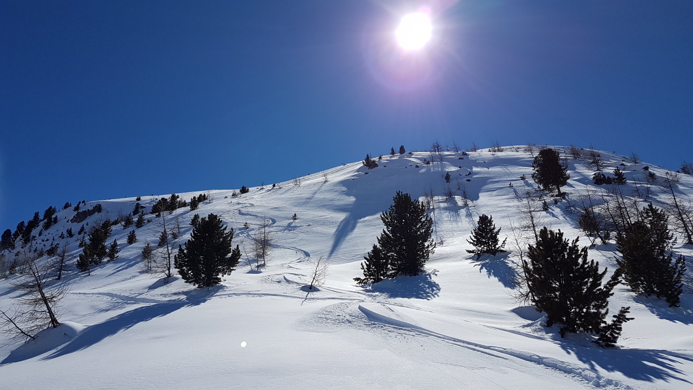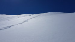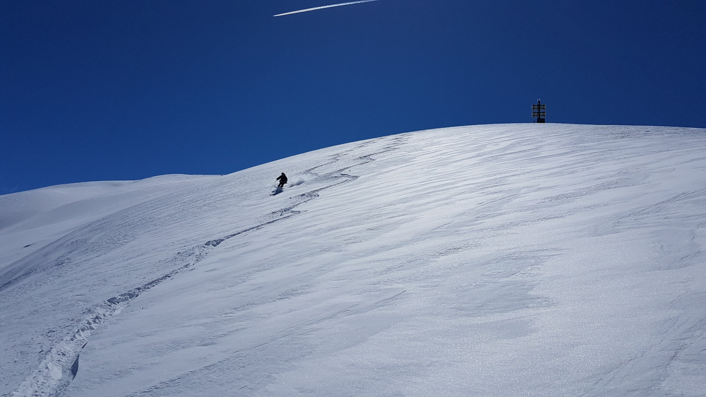 Wir sind zurück mit den Fellen bis zum Vorgipfel und von dort nordöstlich abgefahren. Oberhalb des Steilhangs von Blanchetta haben wir nach links gequert zur Aufstiegsspur. Im Steilhang viel eingeblasener Schnee. Wir haben nichts ausgelöst, trotzdem muss man dort vorsichtig sein. Im Wald war der Schnee im oberen Teil noch ganz gut fahrbar, weiter unten dann gedeckelt.