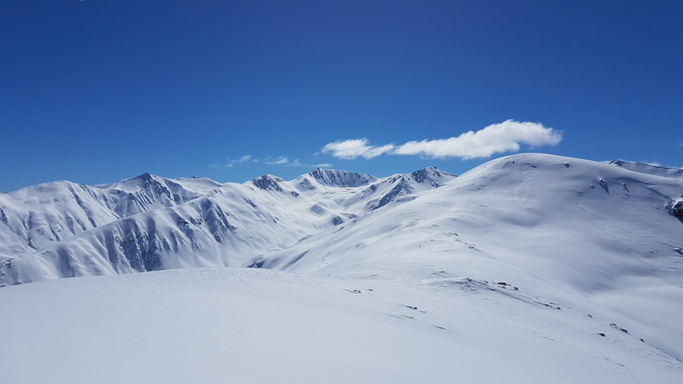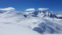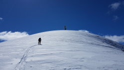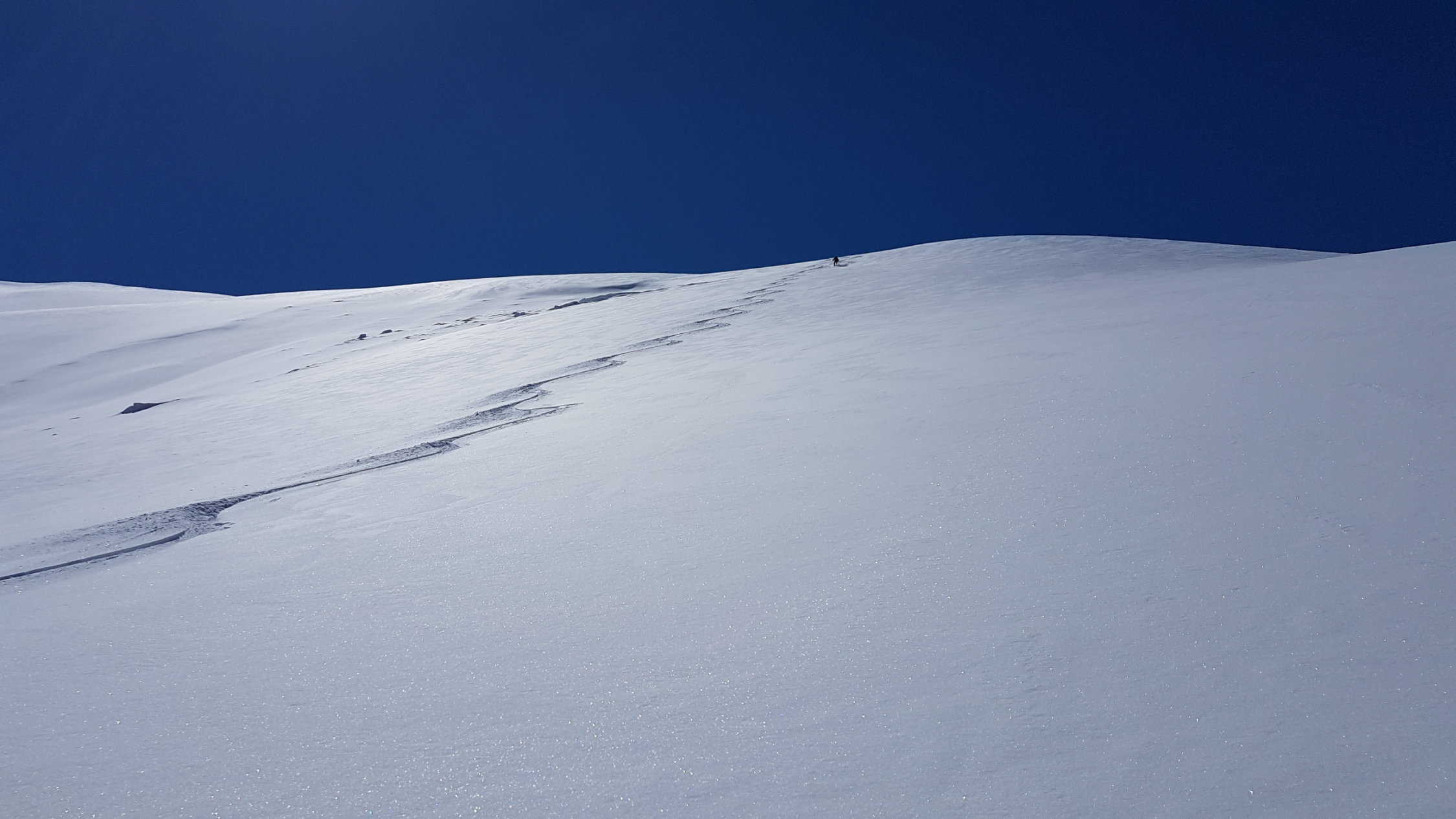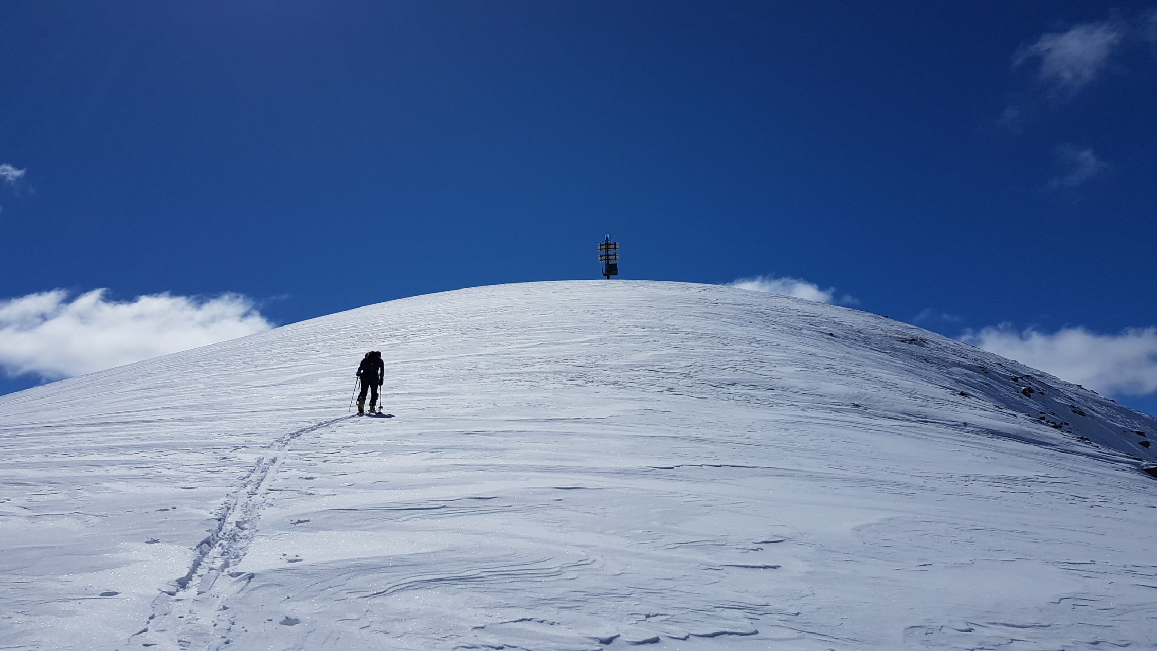 Am Morgen noch etwas bedeckt, deshalb nur ein paar Grad minus statt der gemeldeten -10. Angenehmer Anstieg, einzig beim grossen Lawinenkegel war es etwas ruppig. Unterhalb Blanchetta wird es etwas steiler. Die etwas zugeschneite Spur bot immer noch spürbare Erleichterung für Mensch und Tier. Der Steilhang oberhalb Blanchetta war stark eingeblasen, da ist Vorsicht geboten. Hier war auch die alte Spur nicht mehr sichtbar, aber Blanchetta mussten wir selber spuren. Oberhalb des Steilhangs wieder problemlose Verhältnisse. Auf dem Gipfel strahlender Sonnenschein und wunderbare Rundsicht.