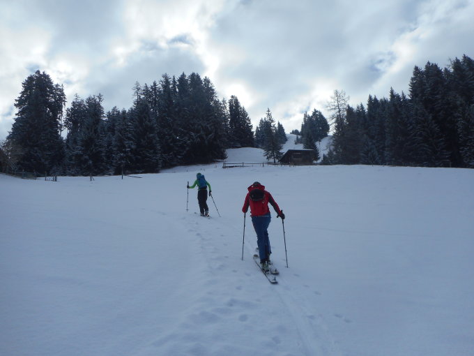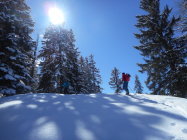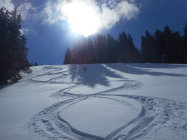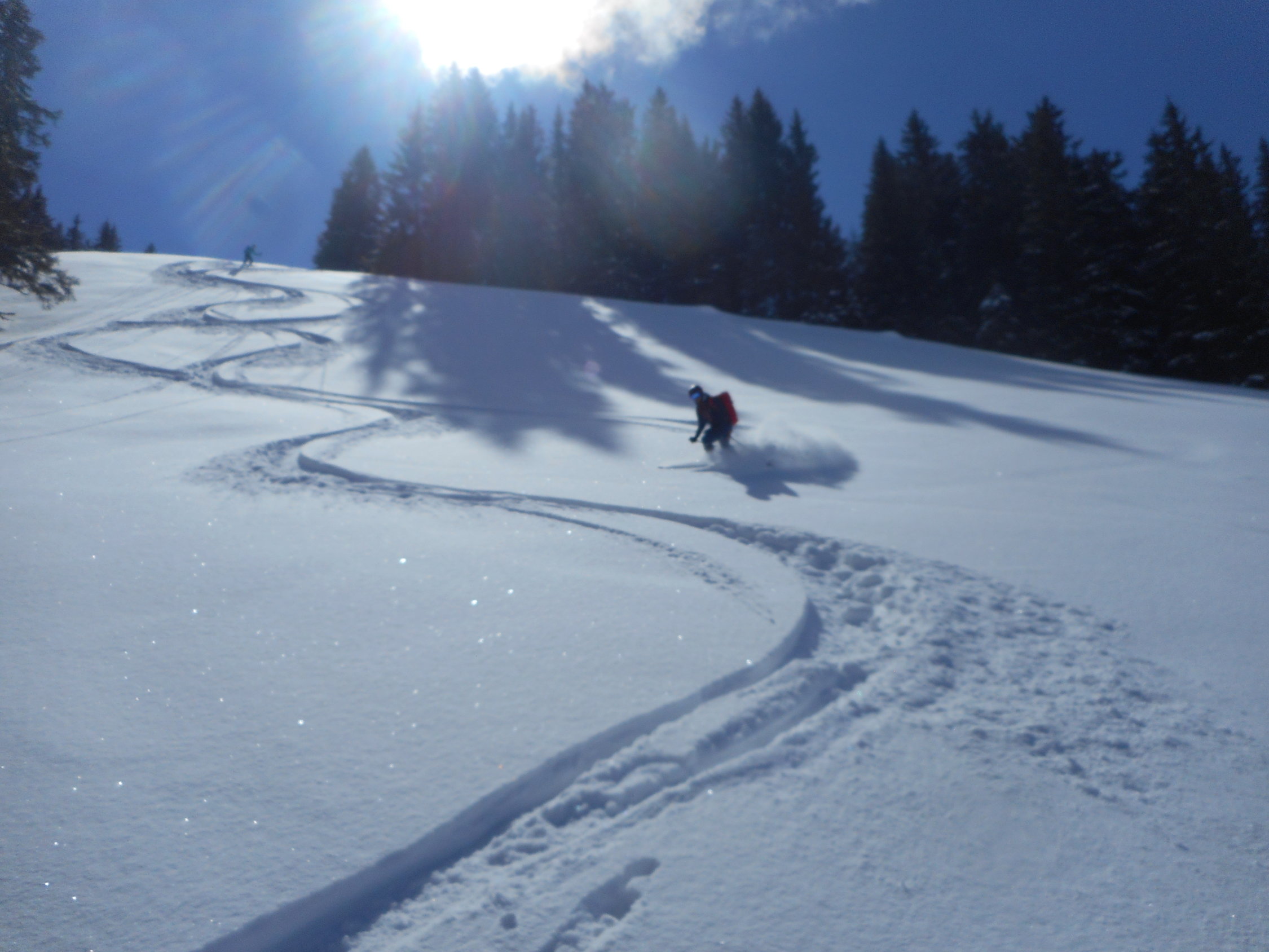 D.h. Sehr schönes Winter-Wetter. Windstill und in der Sonne mild. Der über Nacht gefallene Neuschnee ist ohne Windeinfluss gefallen. Es war wunderbarer Pulverschnee ca. 10cm bis 20cm auf einer tragenden Unterlage.