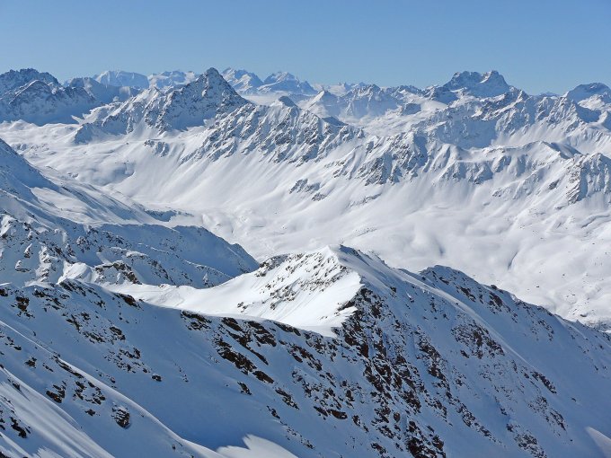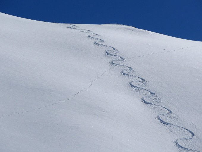 Abfahrt via Mattjischtäli so-so-la-la. Nur Nordhänge haben noch Pulver. Süd- und Osthänge sind z.T. auch noch gut zu fahren (harte Unterlage mit etwas Neuschnee drauf). Bin beim Mittelgrat nochmals hoch auf Punkt 2645m und konnte dann Richtung Bergstation Pischa noch eine schöne Pulverspur legen.
