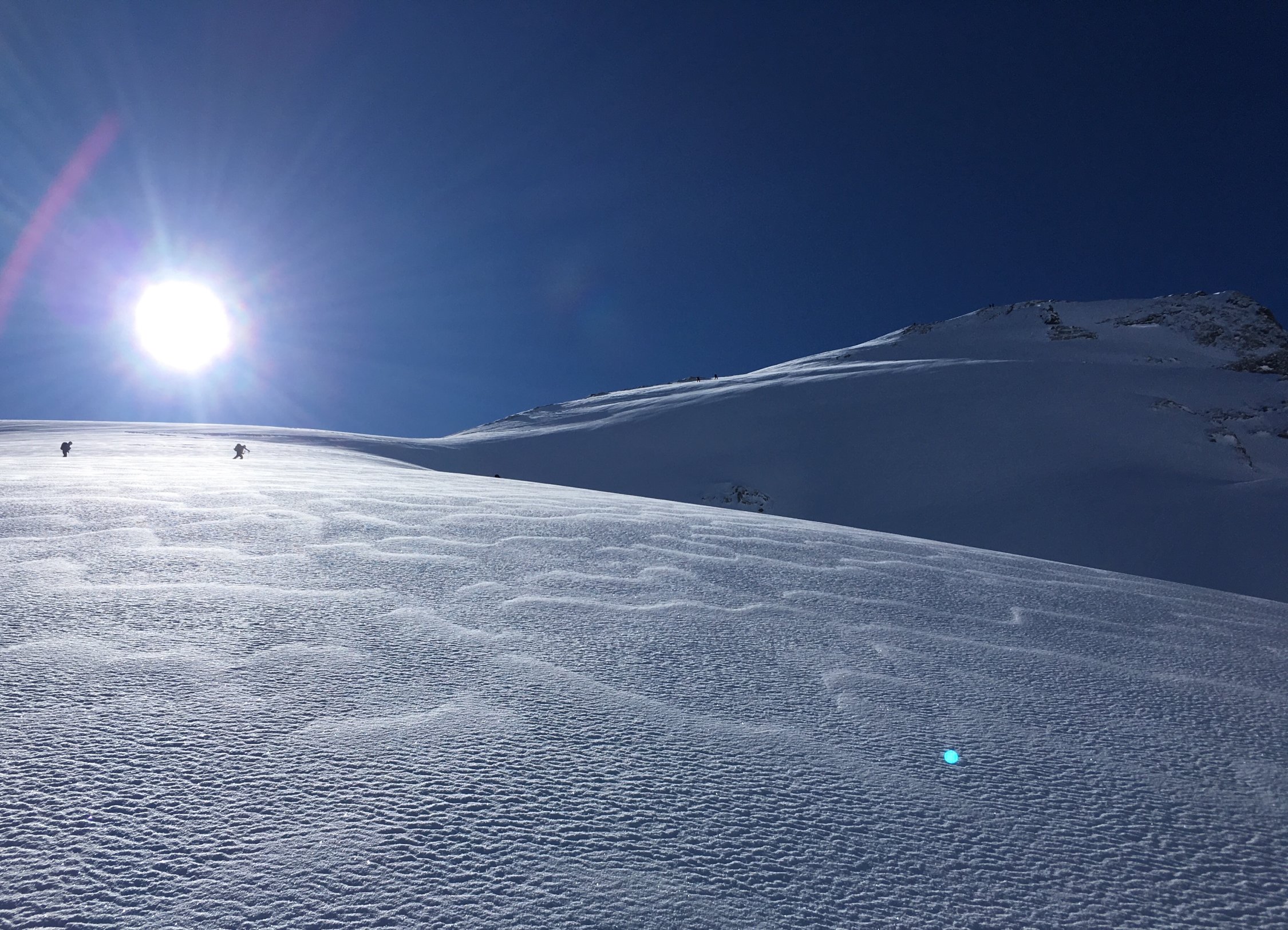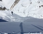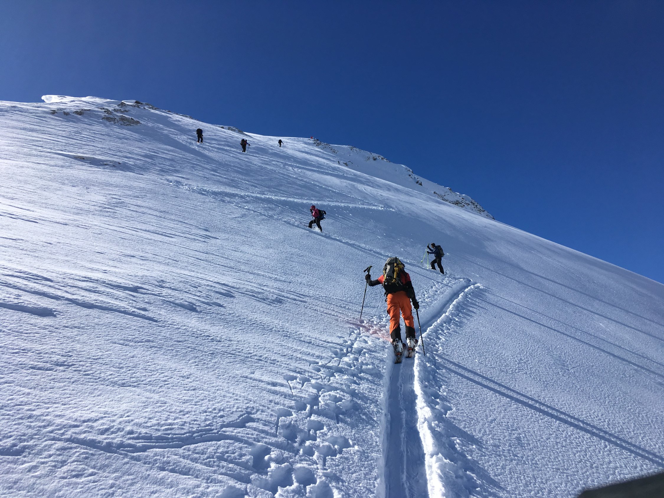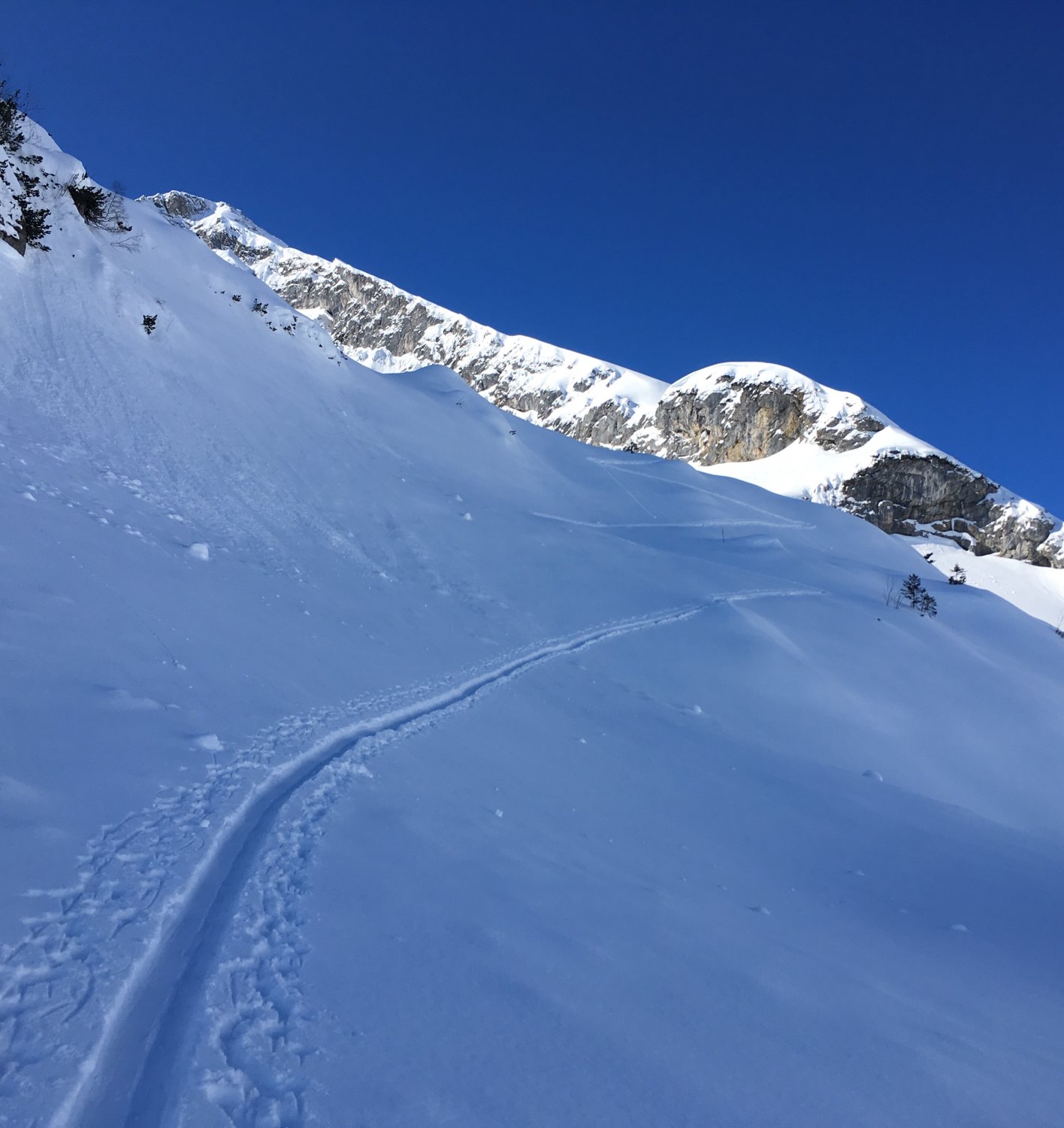The Place to be:-). Perfekte Verhältnisse, Pow von unten bis oben, top angelegte Spur (Danke den Spurern!), bis kurz vor Gipfel ohne Harscheisen.