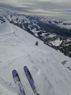 Bei Aufstieg gesehen das Nordculi am Cua auch top sein sollte.Da die 4 noch den Cua Normal angespurt haben,mich auch noch motiviert.Aber fürs Culi...(500 hm./S+)Einfahrt kurz schön,dann nur 10 cm. auf glasig hart,Mitte mit verdecktem Felsriegel und unten unregelmäsig durch alte Abgänge.Sah von weitem besser aus.Na ja,solala,hatten wir schon besser.