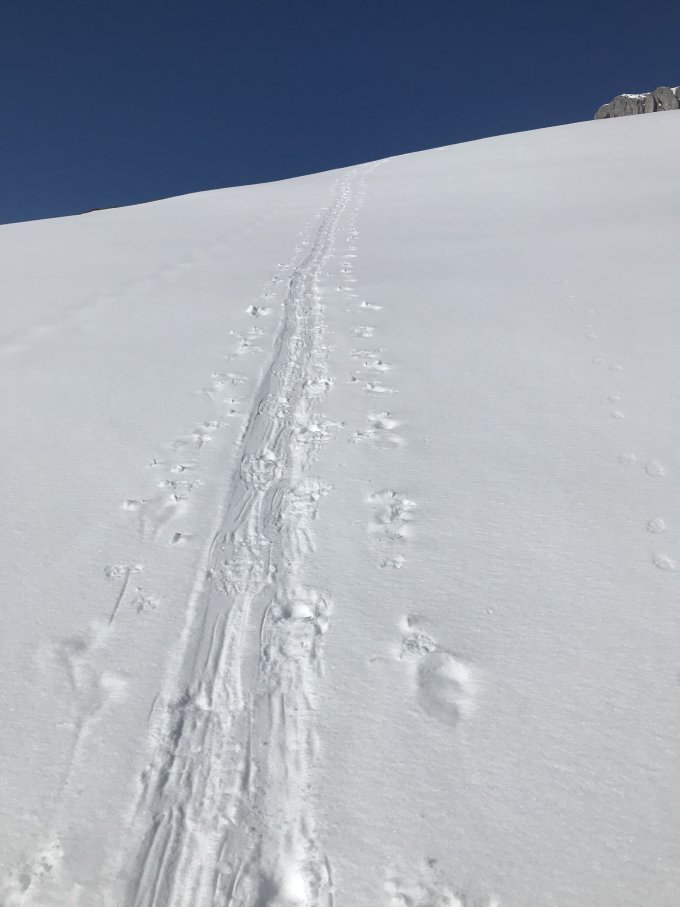 Bei zunehmender Wärme für Schneeschuhe in der doch recht steilen Flanke eher rutschig/sulzig.