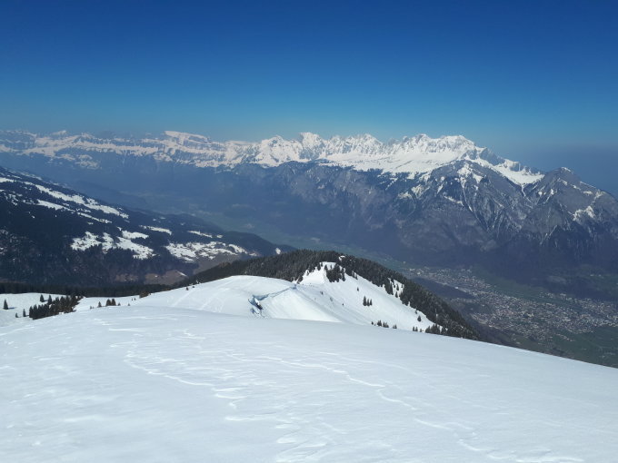 Bis etwa 1050 hat die Waldstrasse wegen Holzschlages an verschiedenen Stellen kein oder kaum mehr Schnee. Danach gute Schneelage bis zum Gipfel. Deshalb Abfahrt bei der ersten Flachstelle nach dem Gipfelhang über die schönen Hänge gegen das Geissloch und die Alp Wald und danach hinüber ins Skigebiet und die letzte Sektion mit der Gondel.