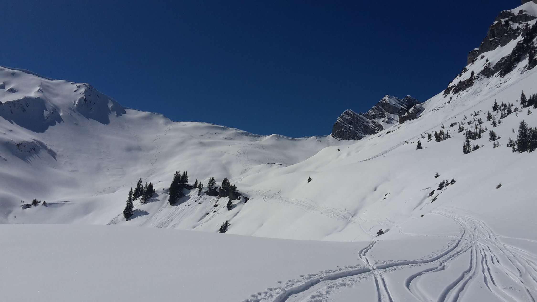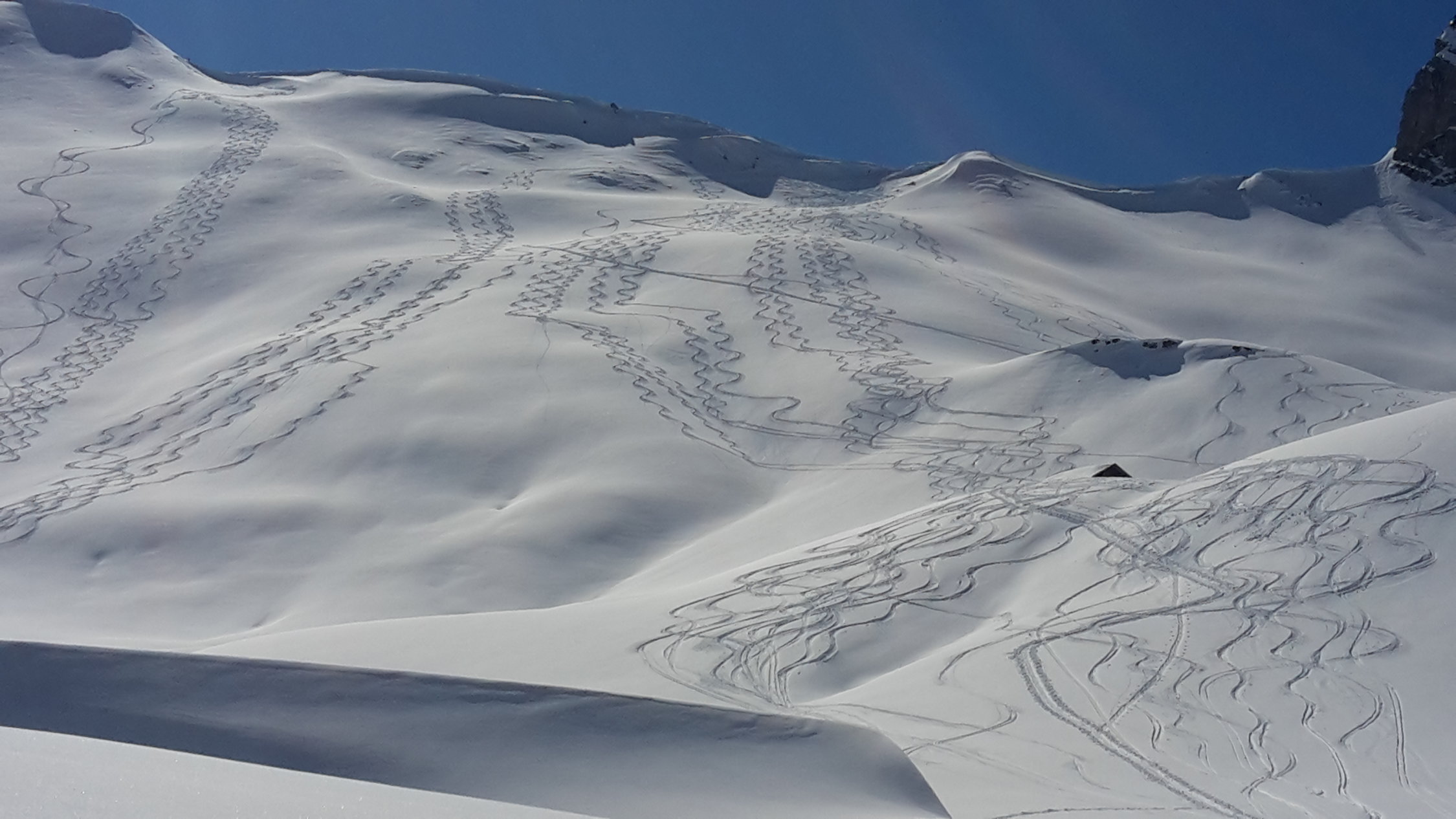 Sonnig, warm, toller Pulver in der Abfahrt. P gleich hinter der Brücke bei Säge, von dort durchgehend Schnee. Cheibehorn, Hohniesen wurde auch gemacht und sah gut aus.