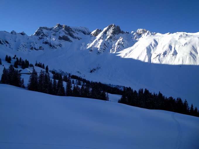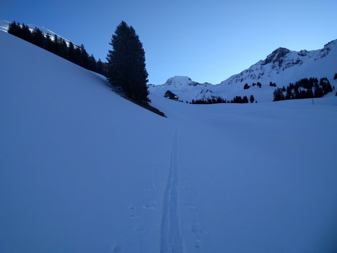 Ab Parkplatz noch genügend Schnee, ab 1600 dann weiterhin viel Schnee, obwohl die Gleitschneelawinen doch einiges abgeräumt haben. An den steilen Hängen viele Gleitschneelawinen sichtbar.