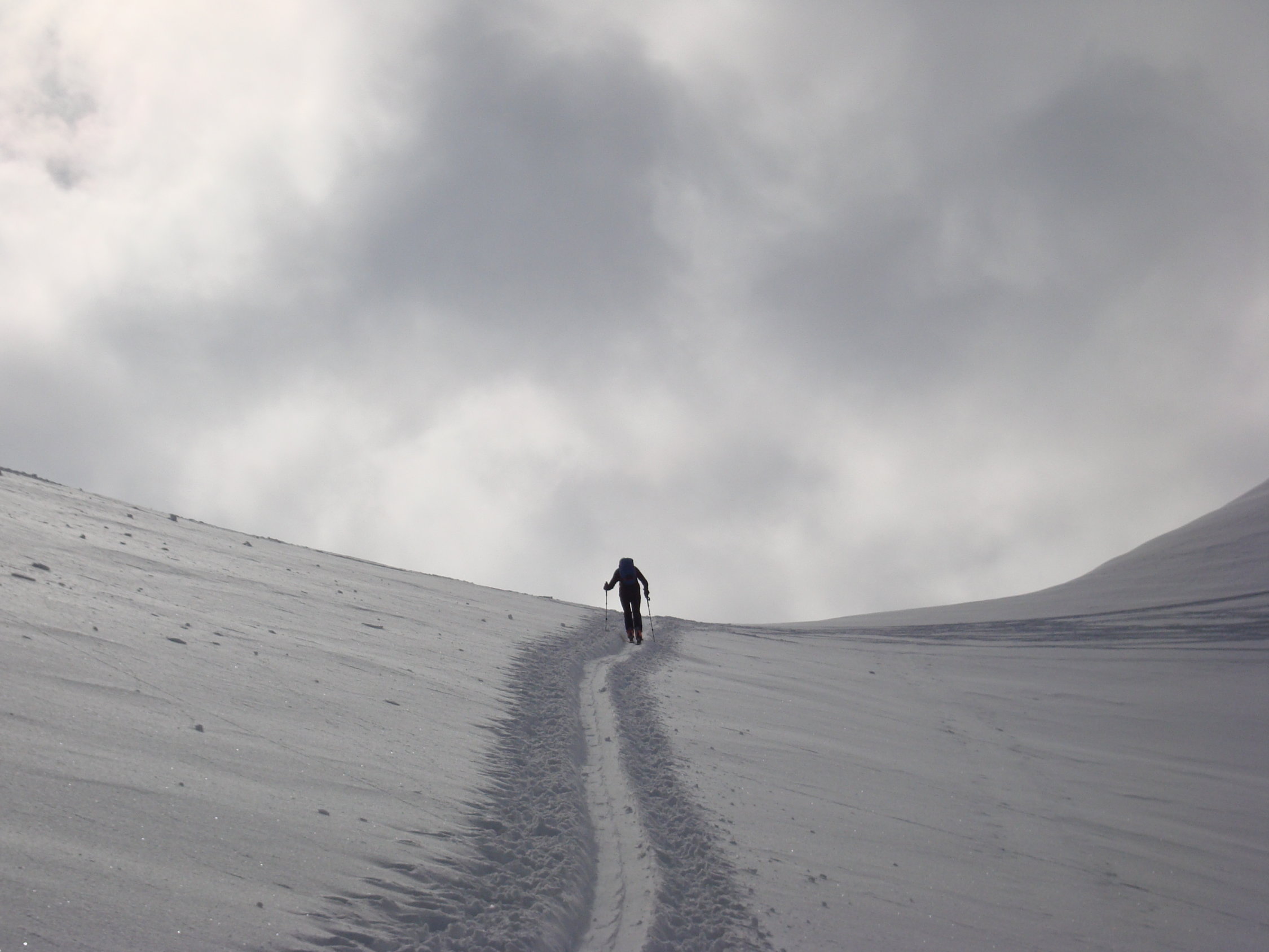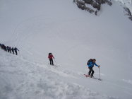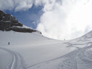 Das ganze Gebiet ist noch mehr als genug eingeschneit. Zum Teil bewölkt mit vielen sonnigen Abschnitten gestaltete sich der Aufstieg als sehr angenehm. Ab Lidernenhütte bis zum Skidepot ist eine gut gelegte und griffige Spur vorhanden. Harscheisen waren heute nicht nötig. Die Neuschneemenge vom letztem Schneefall beträgt so ca.30cm.