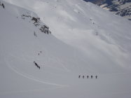 Erstaunlicherweise recht wenig zerfahren trumpfte diese Variante bis ins unterste Drittel auch noch mit schönstem Pulver auf. Erst im steilerem Waldbereich war der Schnee etwas schwerer aber immer noch zum Kurzschwingen animierend. Der Rest bis zum Schluss dann so etwas wie Sulz.