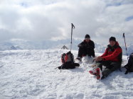 Der Aufstieg vom Skidepot zum Gipfel ist derzeit gut im Trittschnee machbar und das Drahtseil liegt frei. Mit den Wolken und einer doch recht guten Sicht auf die umliegenden Gipfel und noch nahezu windstill, war der Aufenthalt oben sehr angenehm und von etwas längerer Dauer.