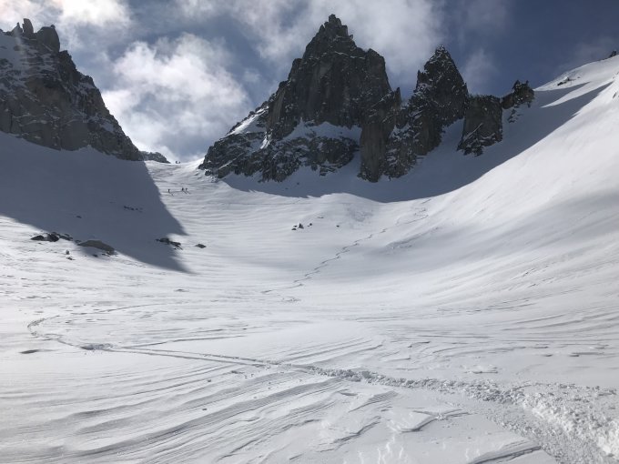 Abfahrt via Spitz Stein. Im oberen Teil alles verblasen. Ab 2600hm gings dann aber richtig zur Sache. Pulver bis fast zum See runter. Abfahrt via Schlittelbahn nach Abfrutt. Danke den Baslern für das Mitfahren.