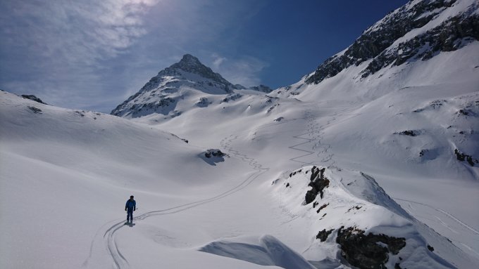 Pulver bis fast zum Schidepot, dann Hartschnee, guter Trittschnee zum Gipfel