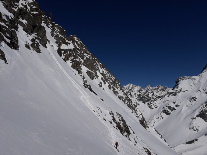 Oben hartgepresster Schnee, ab 3300m Pulver, sehr tief. Am westlichen Gletscherrand die Steilrinne runter bei sicher 50cm Schnee, der Rest unten raus ebenfalls sehr schön pulvrig bis ca. 2200m, danach sulzig aber gut zu fahren.