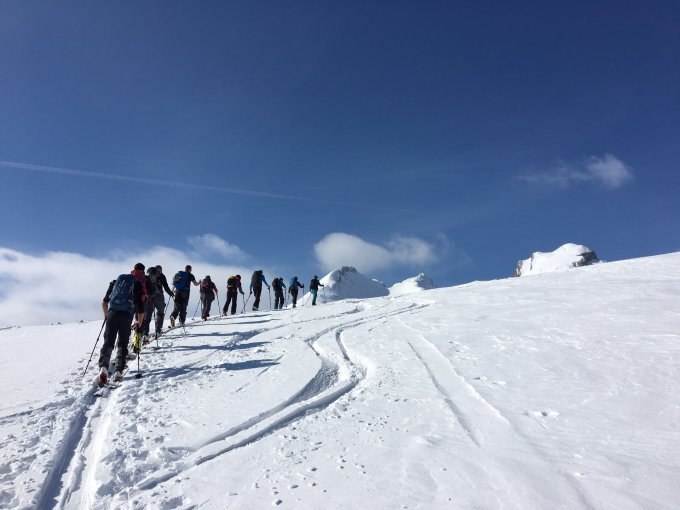 Sehr gute Verhältnisse im ganzen Gebiet. Das Skidepot im Sattel erreicht man mit wenigen Spitzkehren, Harscheisen sind nicht nötig.