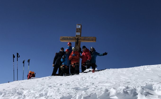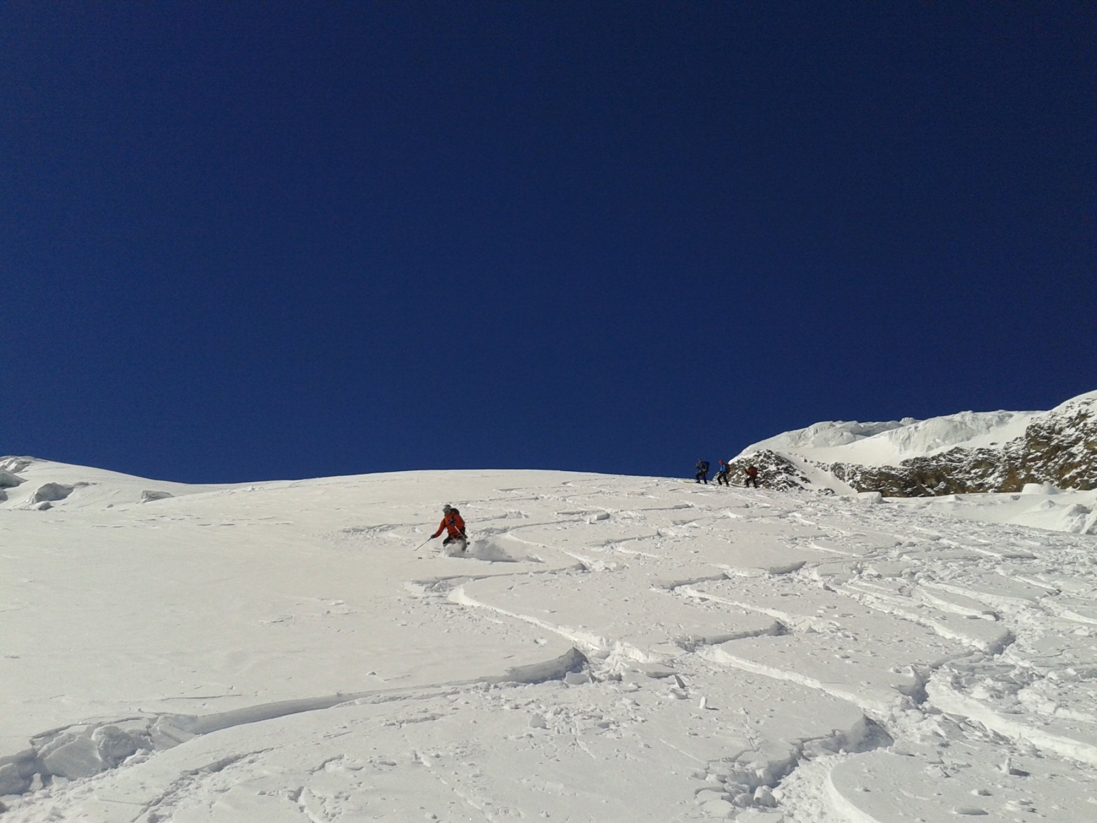 über 3500m Winddeckel (teilweise tragend). Gipfelhang tragend und gut zu fahren. Gletscher super eingeschneit - das wird heuer eine super Hochtourensaison!