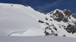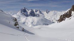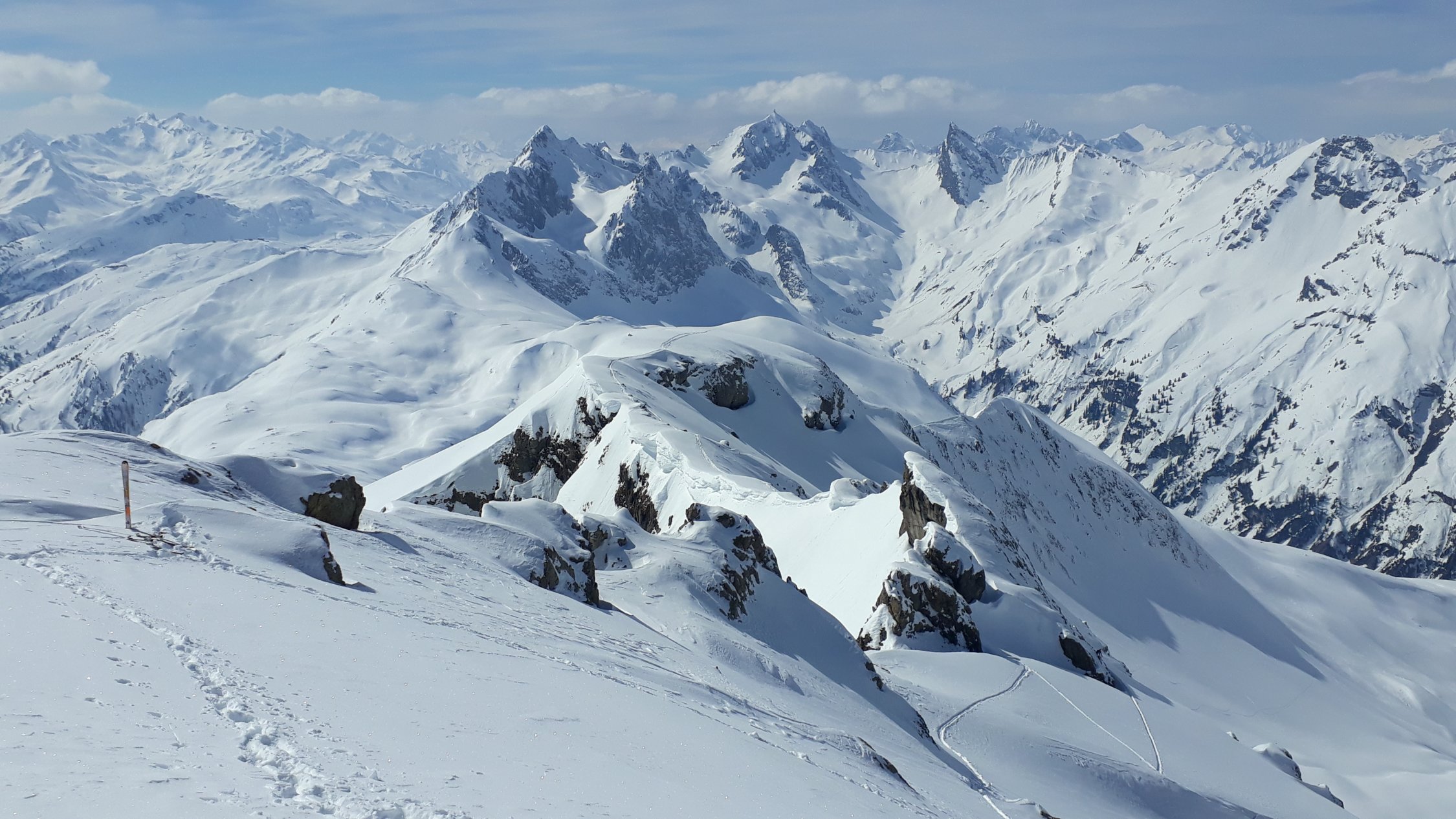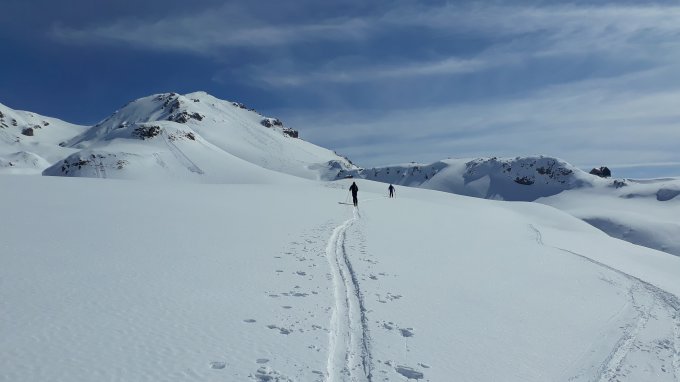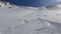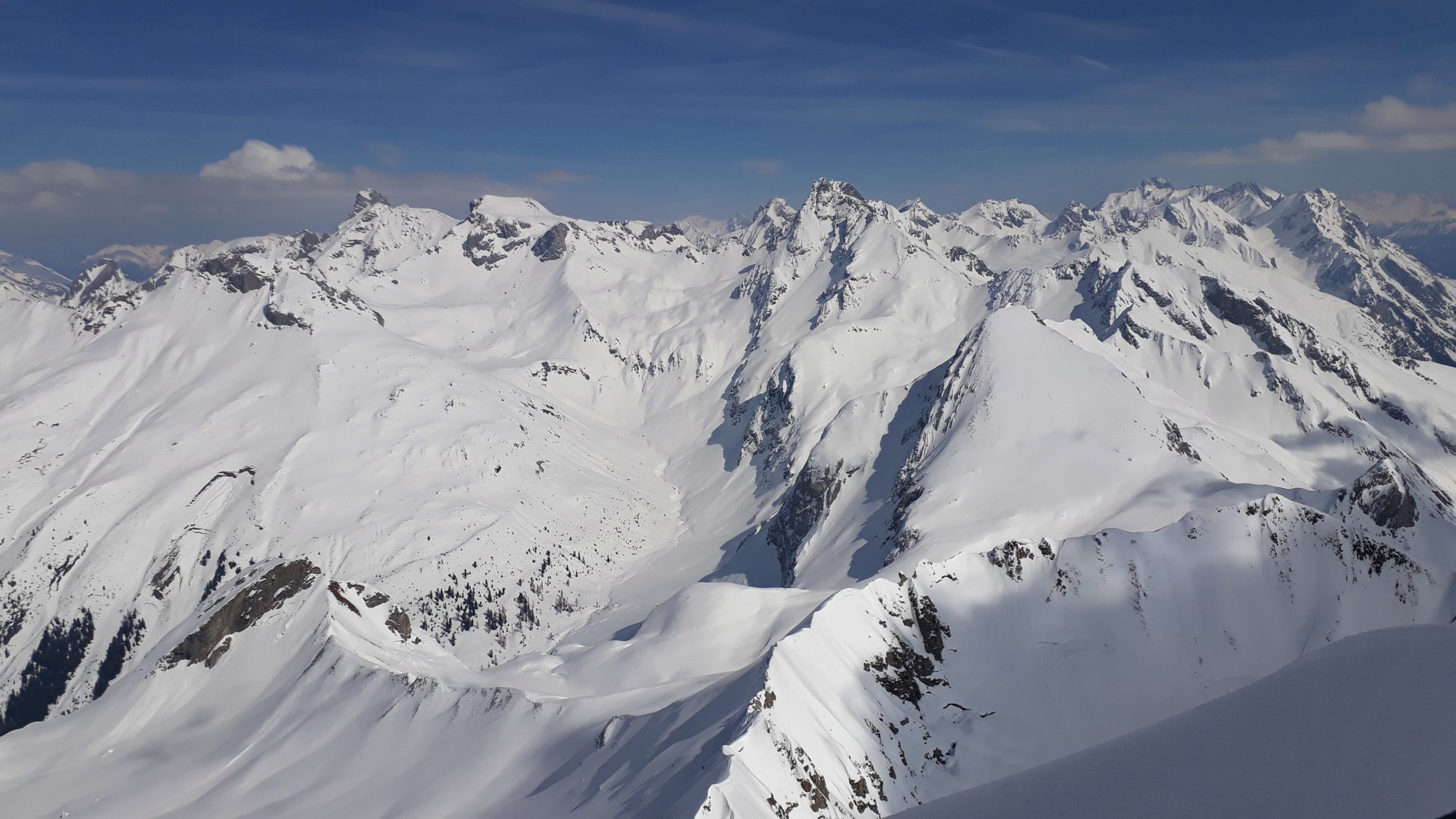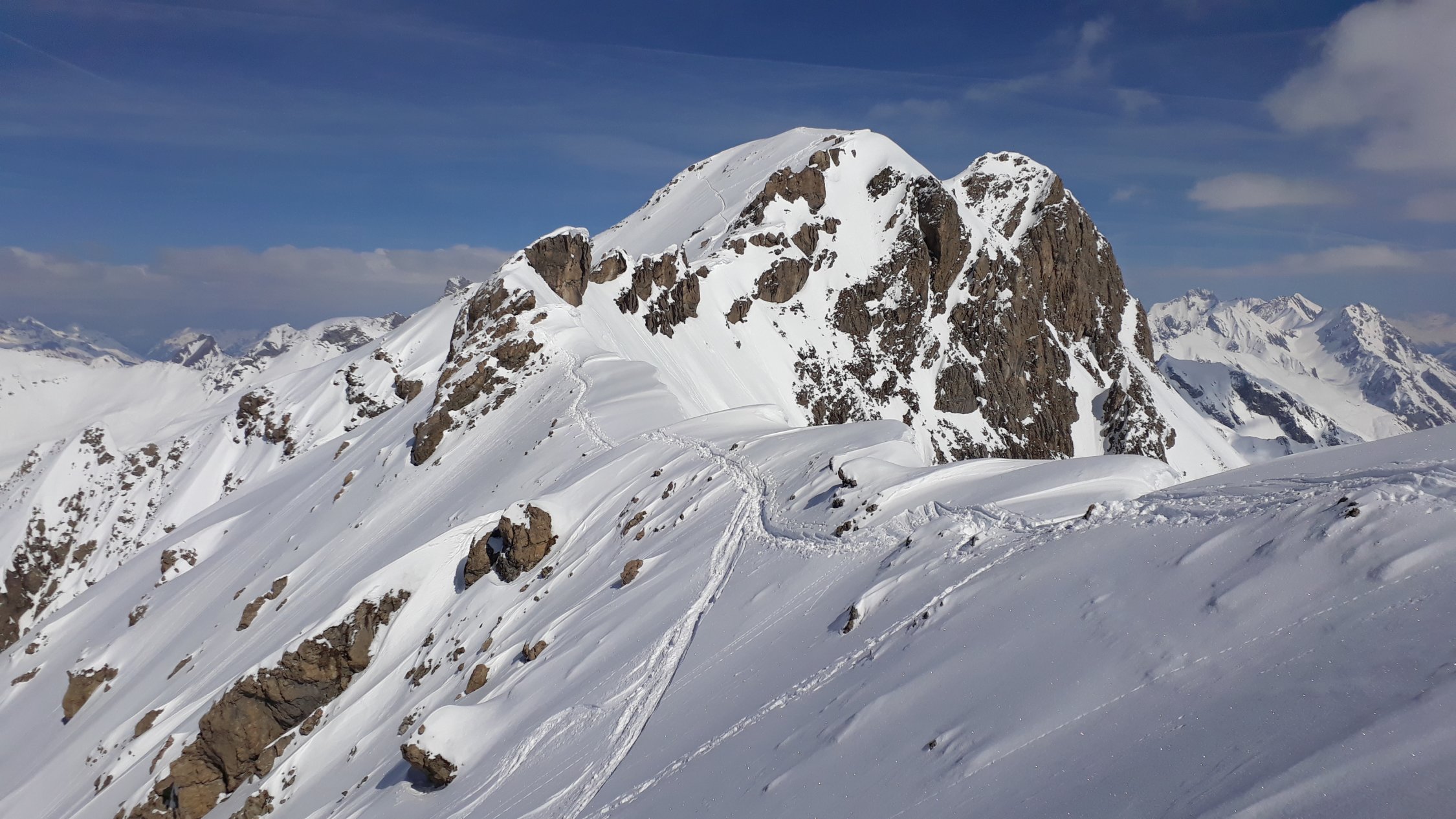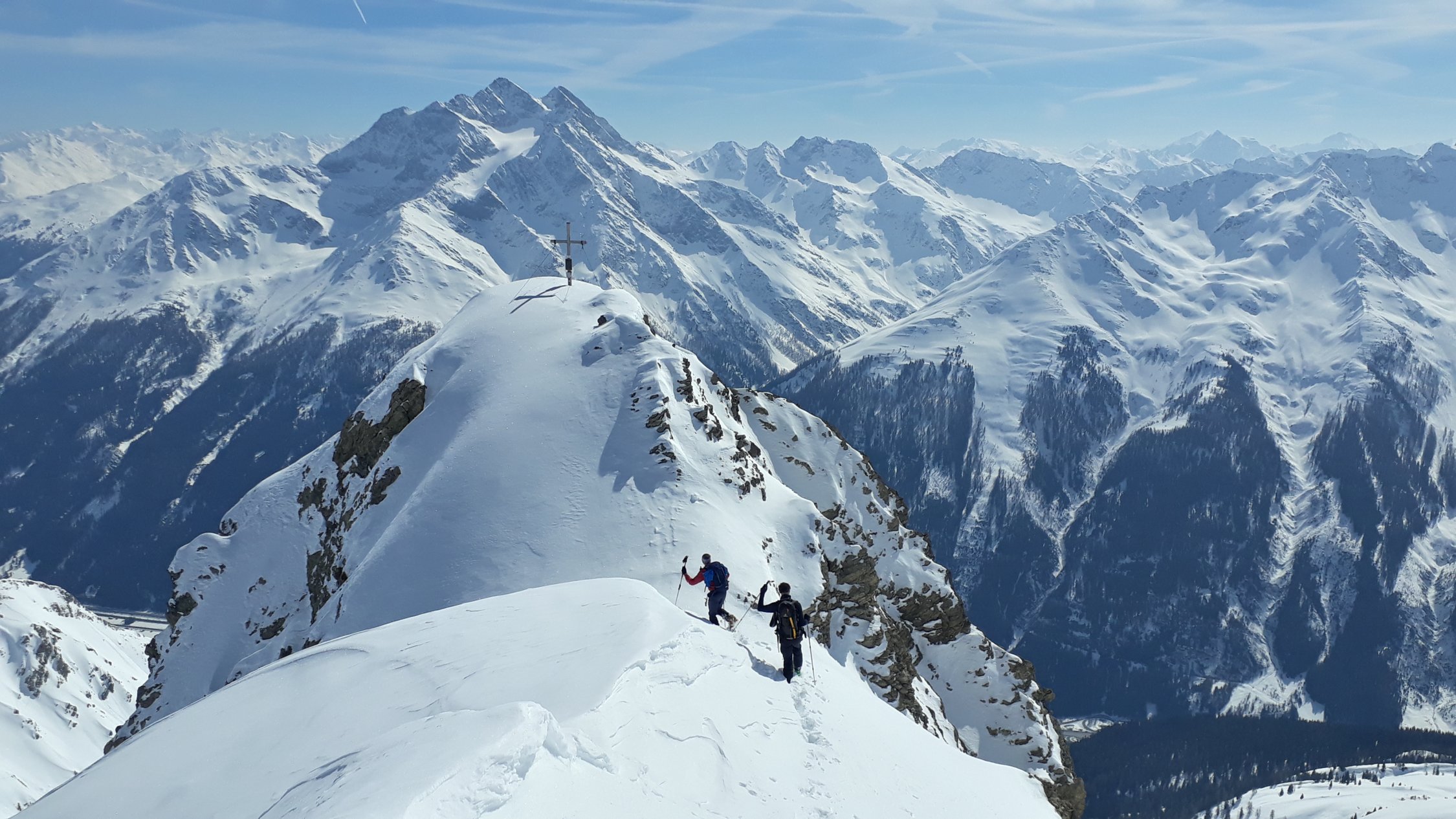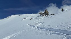 Diese Tour steht und fällt mit den Schneeverhältnissen, da aus dem Almajurtal ein längerer Waldgürtel zu durchqueren ist, der bei zu geringer Schneeauflage, so wie es uns vor einigen Jahren passiert ist, nur sehr zeitaufwändig zu bewältigen ist. Damals haben wir dann aus Zeitgründen den Gipfel nicht erreicht. Heute sehr gute Schneeverhältnisse mit viel Schnee im Wald. Die Route war bis zum Vorgipfel gespurt, so dass die manchmal nicht einfache Wegfindung kein Problem war. Vom Vorgipfel weg gab es keine Aufstiegsspuren mehr, so dass sich für uns der alpine Touch der Tour einstellte. Zunächst ein verwächteter Grat, der weit links genommen werden mußte, dann ein Übergang mit den Skiern auf dem Rucksack über einen Felsriegel, dann ein Aufstieg mit Skiern über einen lawinenmäßig tückischen Gipfelhang (Anriß des Vorsteigers eines kleinen Schneebretts ohne Abgang). Der Übergang zum Kreuz war in tiefem Trittschnee gut möglich. Wir fuhren vom Gipfel weg vorsichtig mit Skiern ab, weiter unten, nachdem wir noch vor dem Vorgipfel einen Riesenhang nach Norden abfahren wollten, gab es ein Wumm-Geräusch, so dass beschlossen, nach 50 Metern Abfahrt vorsichtig zu Fuß wieder nach oben auf den Grat zu steigen. Weiter unten bot sich dann eine sicherere Möglichkeit im traumhaften Kanada-Powder der Nordseiten abzufahren. Ganz unten im Waldgürtel wurde der Schnee dann weicher, aber durch die große Menge war es auch hier ein skifahrerisches Vergnügen bis zum Talboden abzufahren. Insgesamt eine landschaftliche und bei diesem Schnee auch skifahrerische Traumtour für alle, die bereit sind, dafür 24 km auf Skiern zurückzulegen.