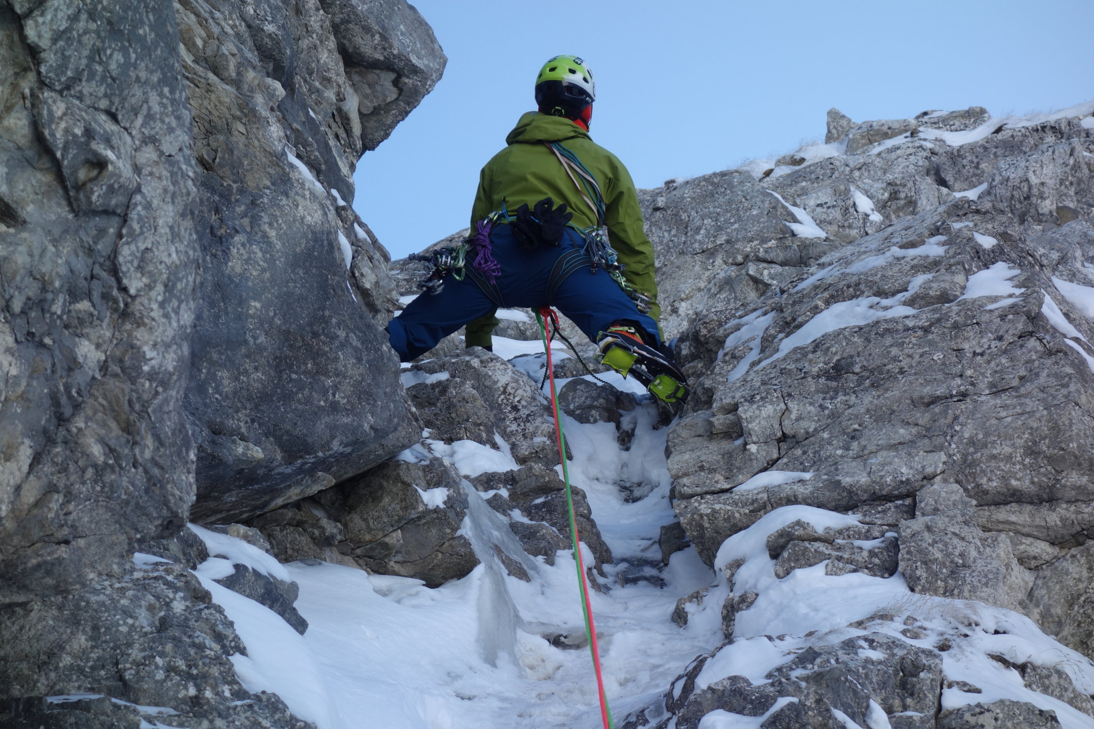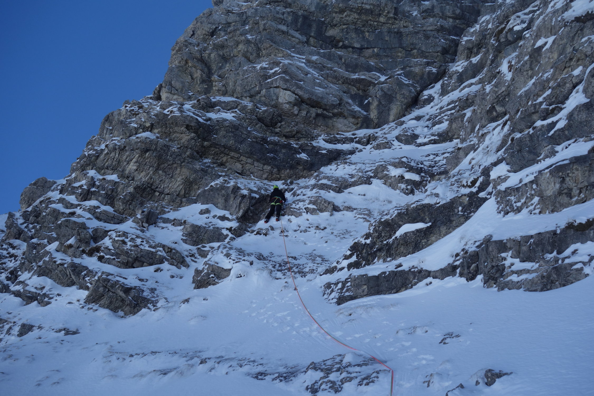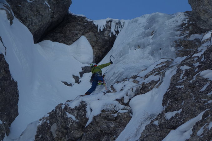 Auch diese Wand weist heuer mehr Eis auf als sonst. Eisqualität gut. Der im Sommer brüchige Fels ist ordentlich zusammengefroren.