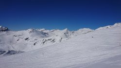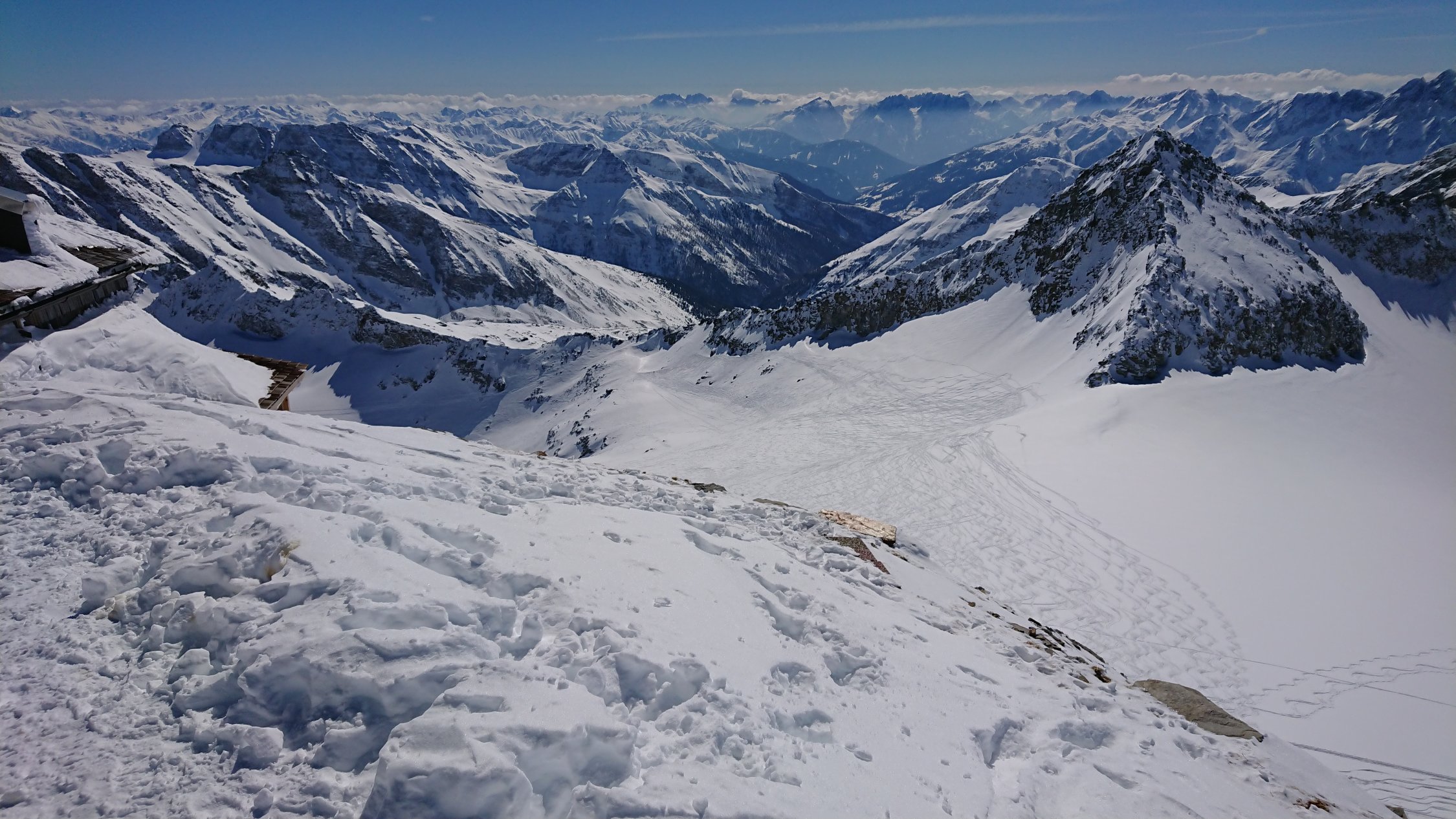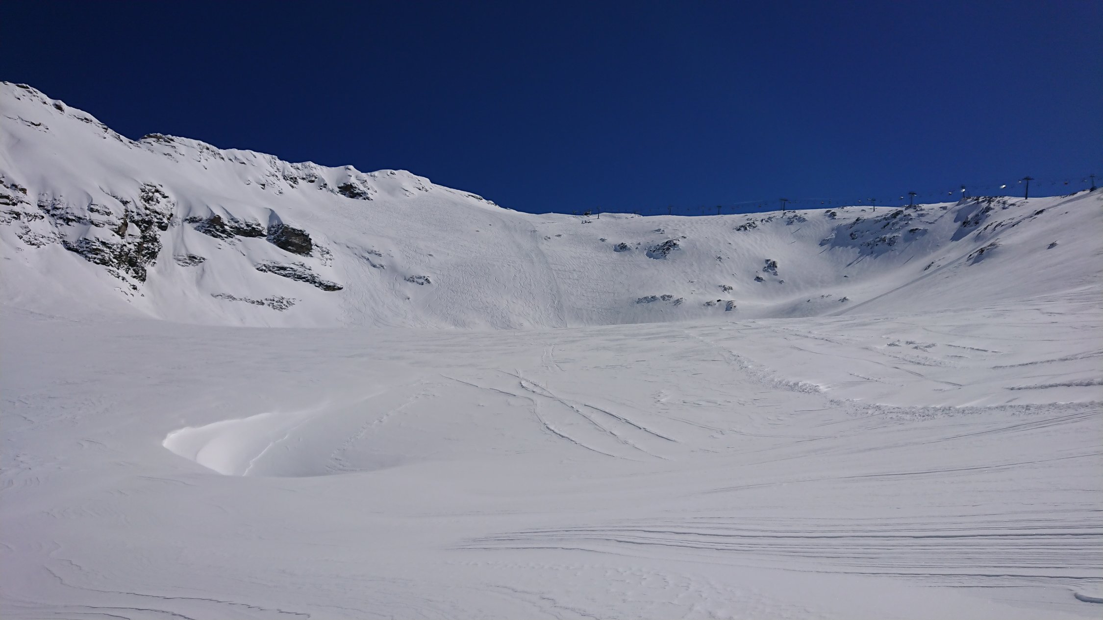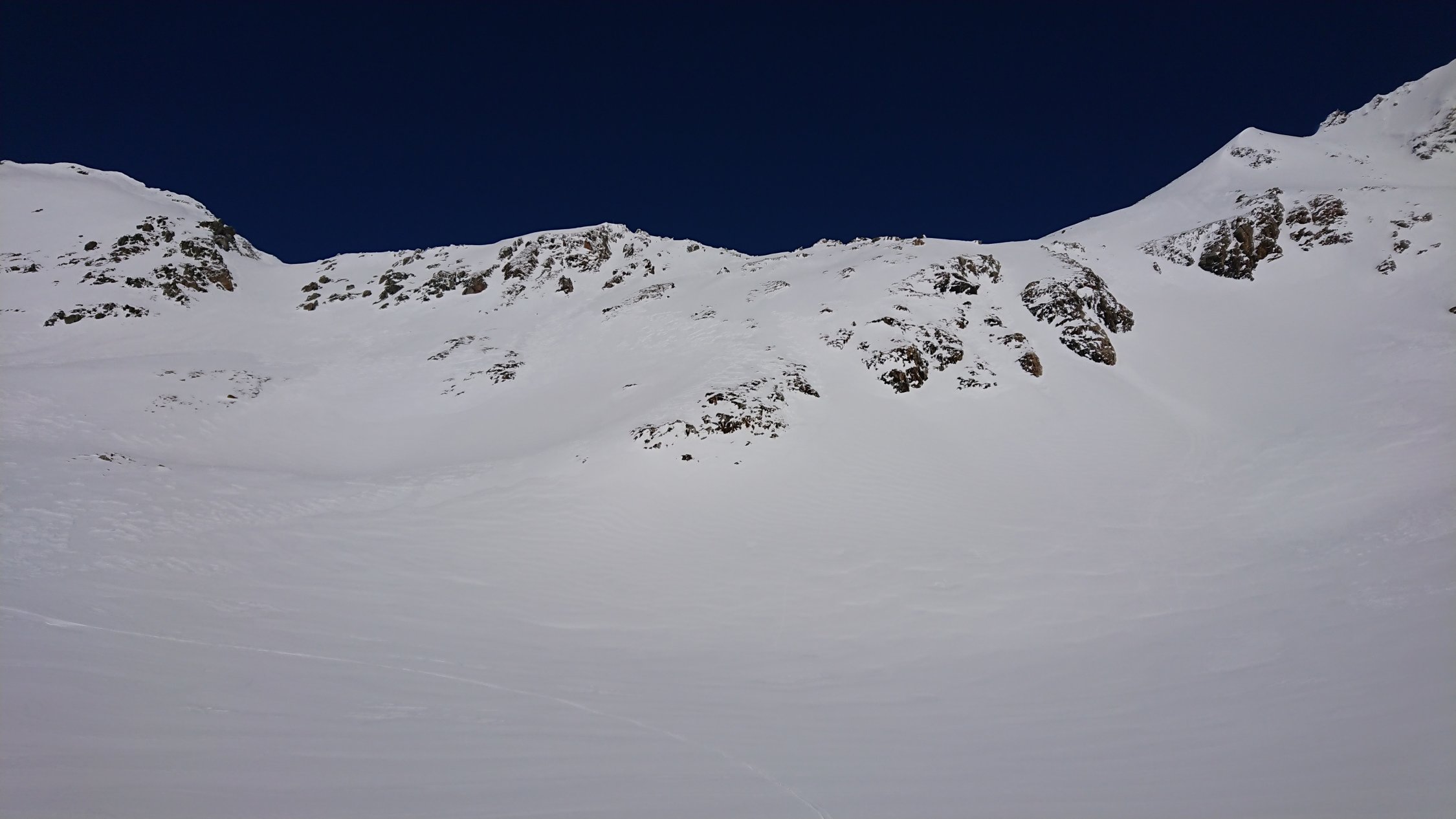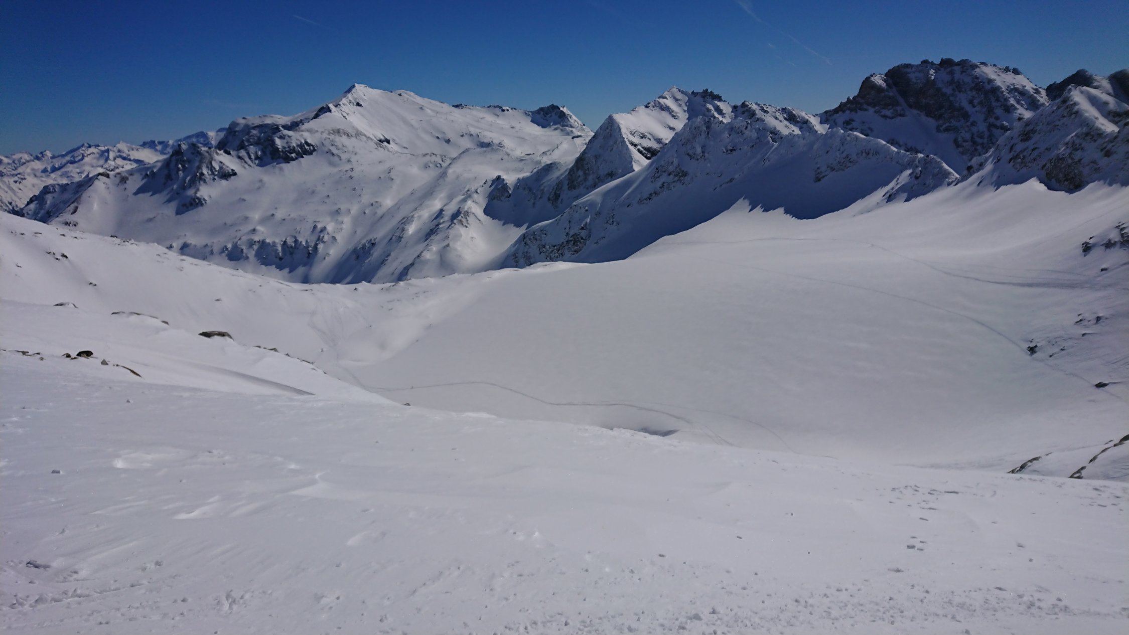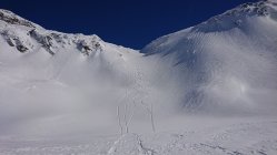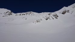 Eigentlich wollte ich hier übernachten, wegen der angesagten Wetterverschlechterung jedoch darauf verzichtet. Abfahrt mit unterschiedlichen Schneearten.