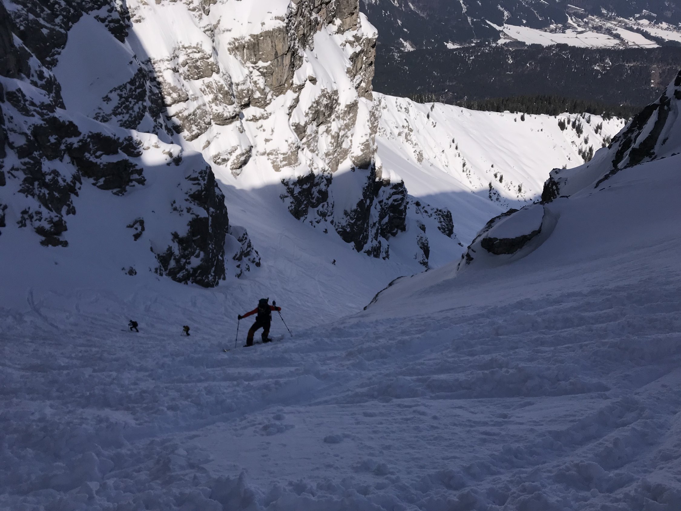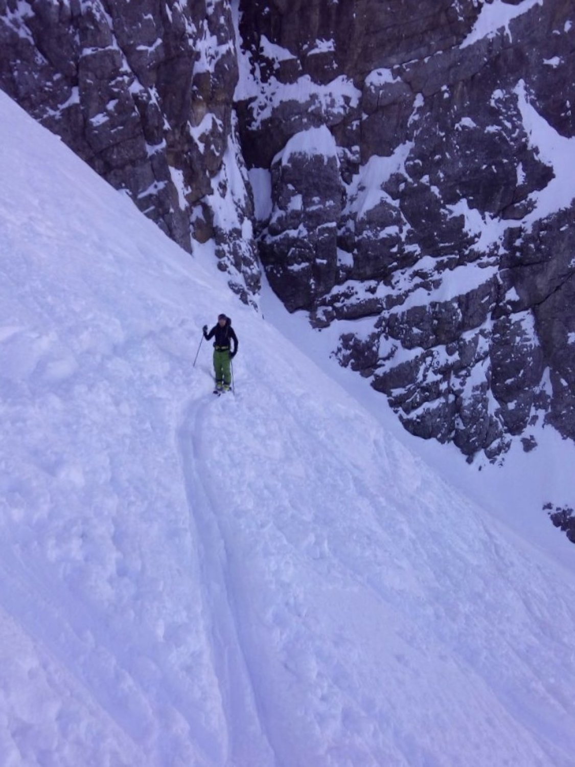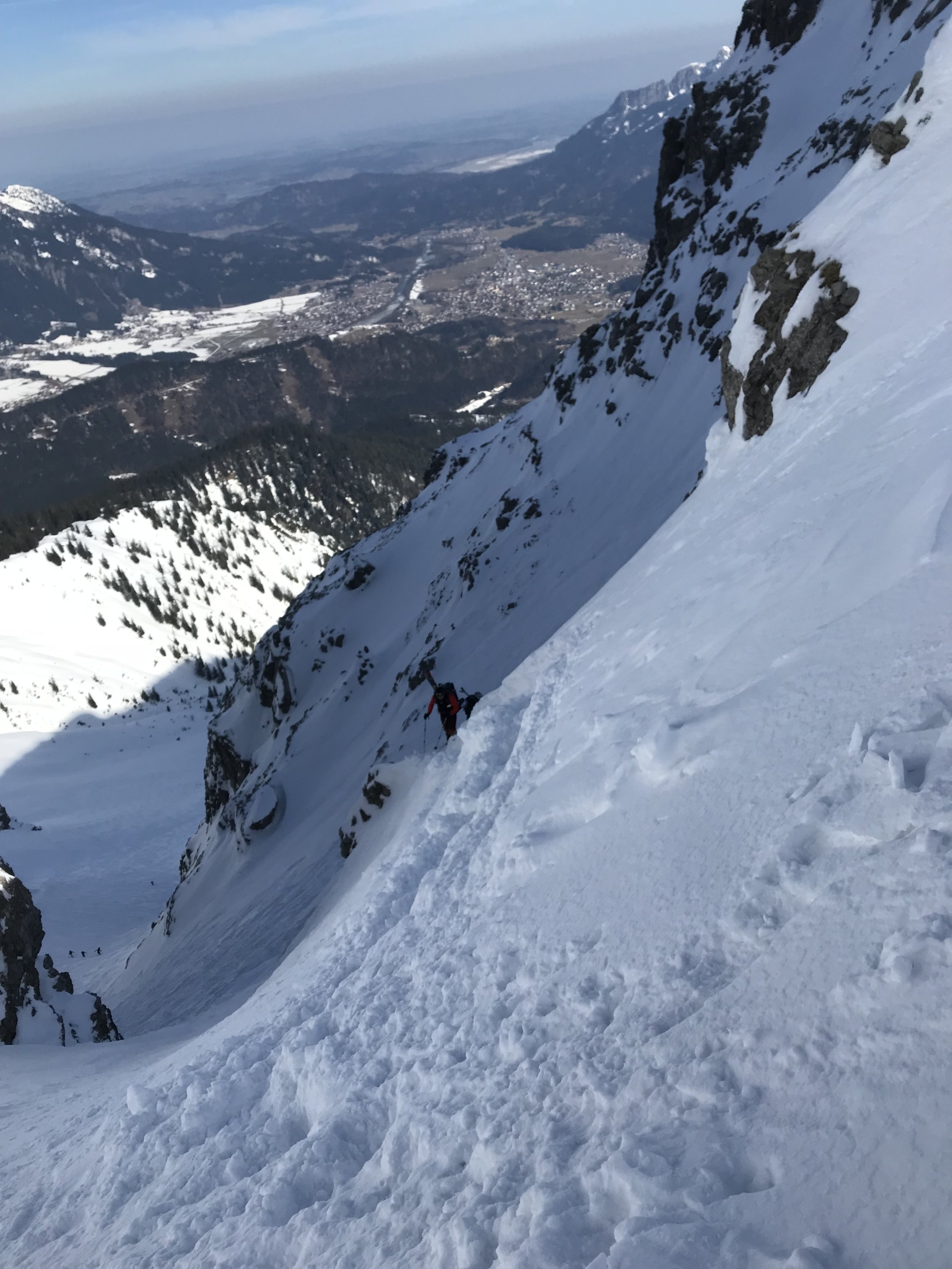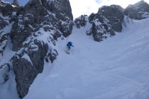 Perfekte Verhältnisse! Überdurchschnittlich viel Schnee. Beim Start hart gefroren nach klarer Nacht. Entlang des Kärlesbaches aufgrund der Schneemenge bequemer Aufstieg. Im Thanellerkar dann bereits feinster Pulver und sehr gut zu gehen. Ausstieg zur Scharte eigentlich auch mit Ski machbar, jedoch diese 50 Meter leichter und sicherer zu Fuß. Auf dem Südrücken dann griffig und problemlos zum Gipfel (Harscheisen waren heute nicht zwingend erforderlich). Einfahrtsbereich Nordrinne sehr gut und in der gesamten Rinne perfekte Schneebedingungen - Pulver und keinerlei Hart- oder Eisstellen. Selbst die beiden Engstellen, an denen man normalerweise abklettern muss, können problemlos komplett gefahren werden. Unten raus zwischen den Latschen und auf den freien Hängen nochmal ein Pulvertraum. Rest im Tobel dann aufgrund der hohen Schneelage auch gut machbar.
