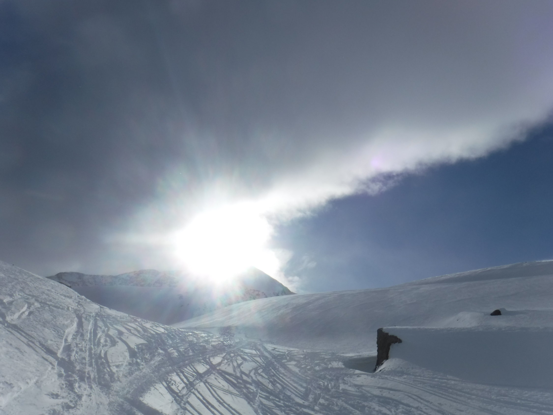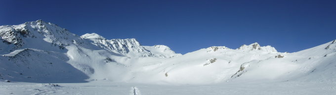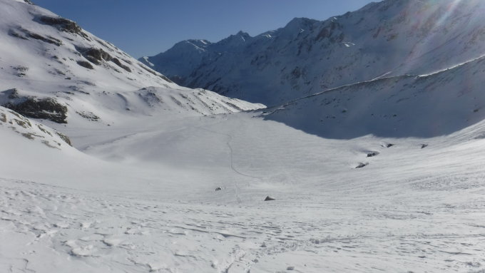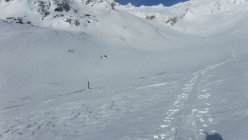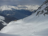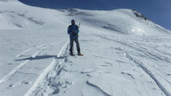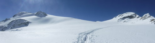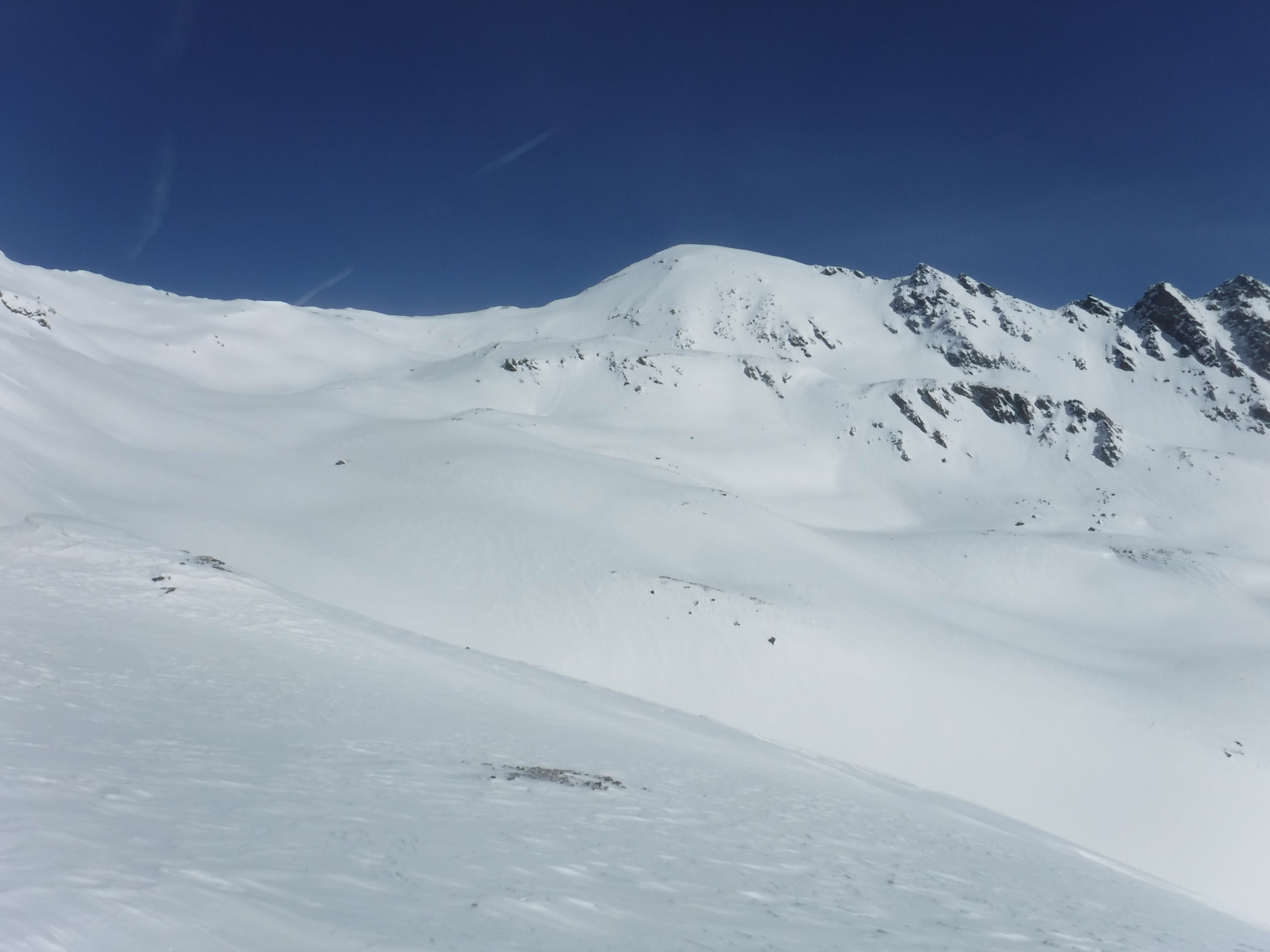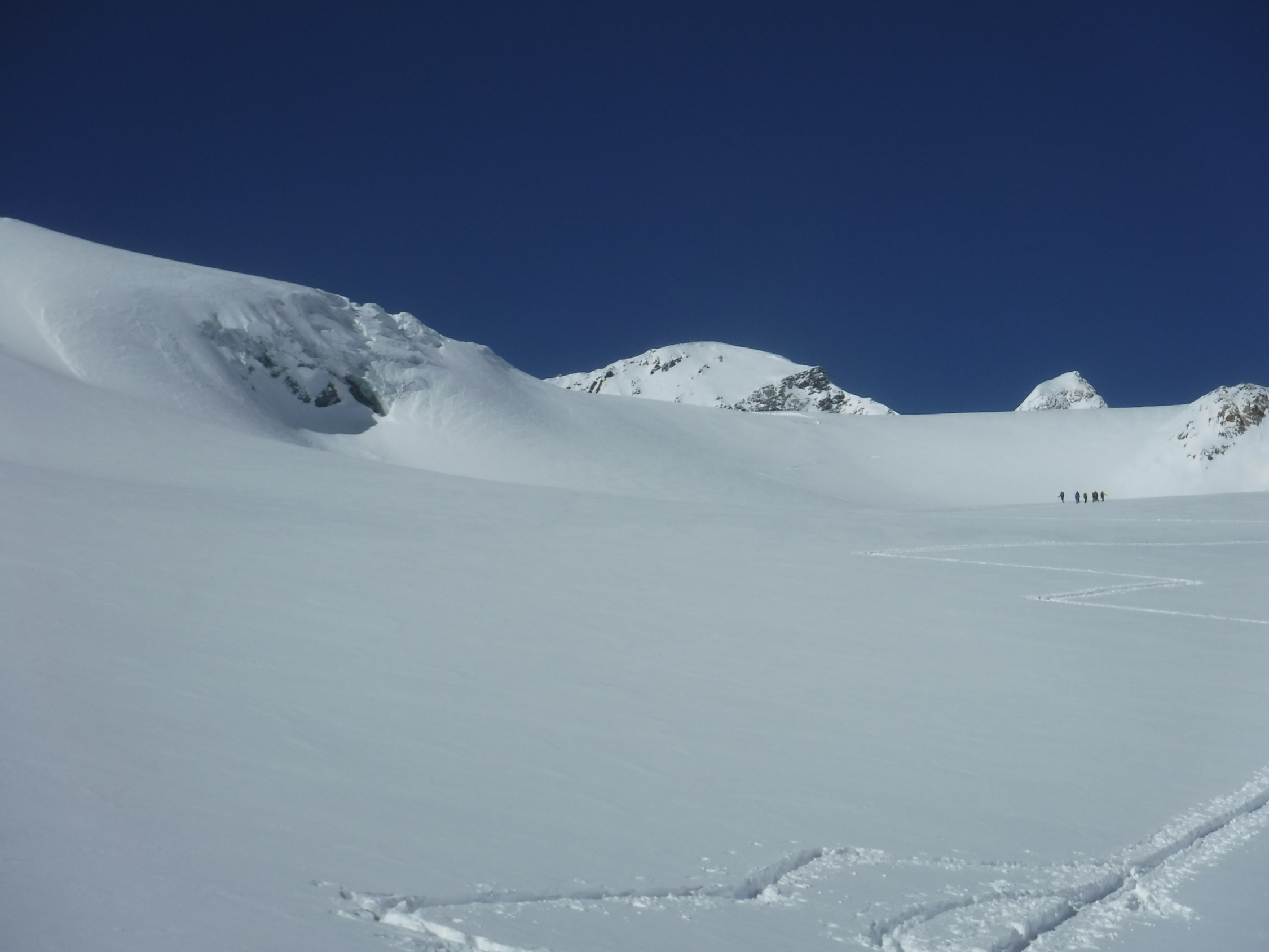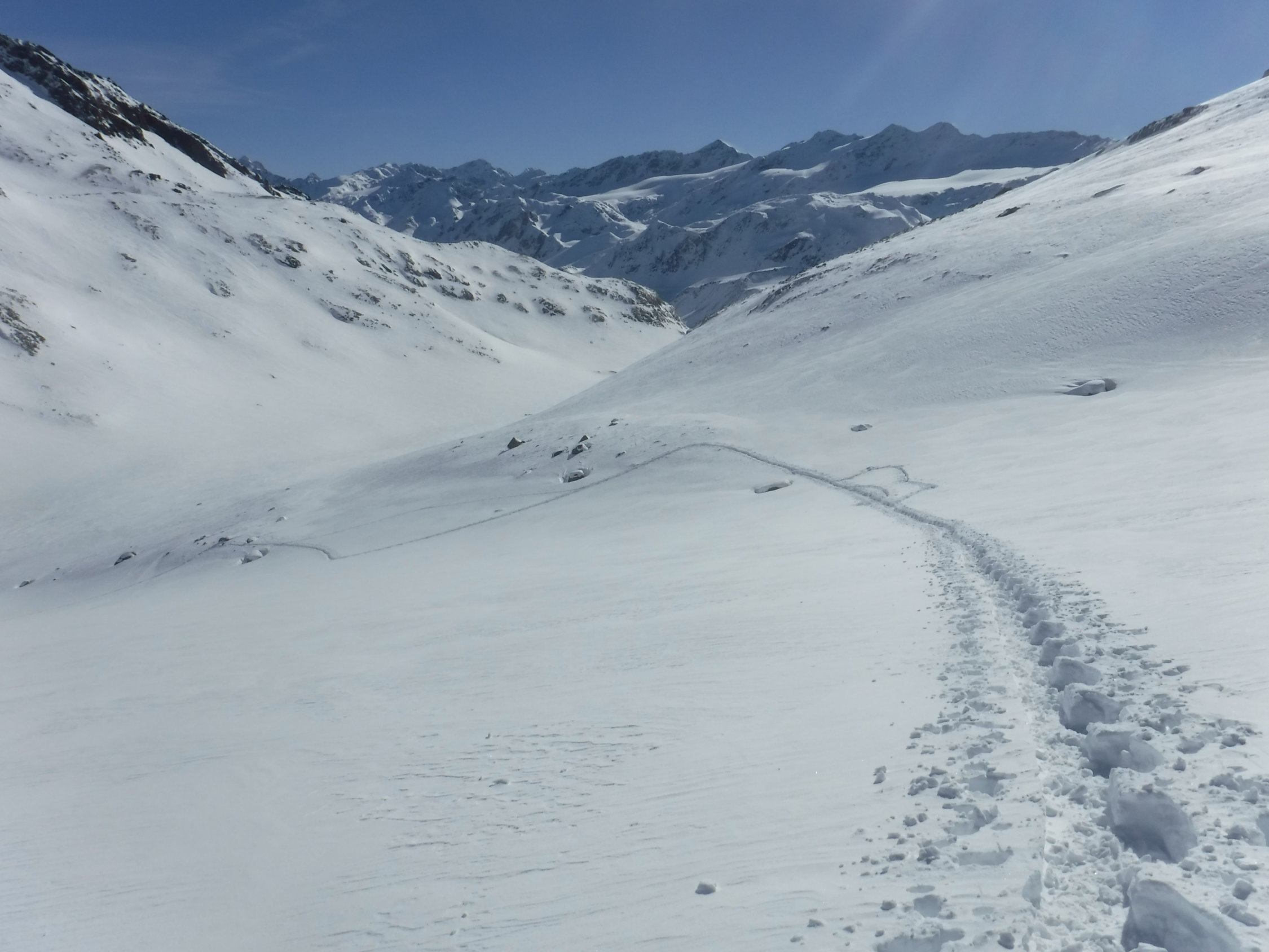 Ich tourte heute zwecks Erkundung nach dem Schneefall und Auswirkungen des starken Nordföhns um zu überlegen, welche Touren in den nächsten Tagen für machbar erscheinen. Nach der Casatihütte machte ich ab P 3230 einen Abstecher zum Monte Cevedale. Allerdings nur bis unterhalb der Eisstufe, da es schon spät war (14:10 Uhr). Umgekehrt dann zu den 3 Kanonen. Ich wollte schließlich im Hellen zurück und das gute Abendessen auf der Zufallhütte nicht verpassen.