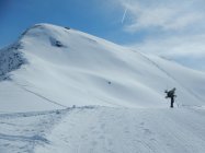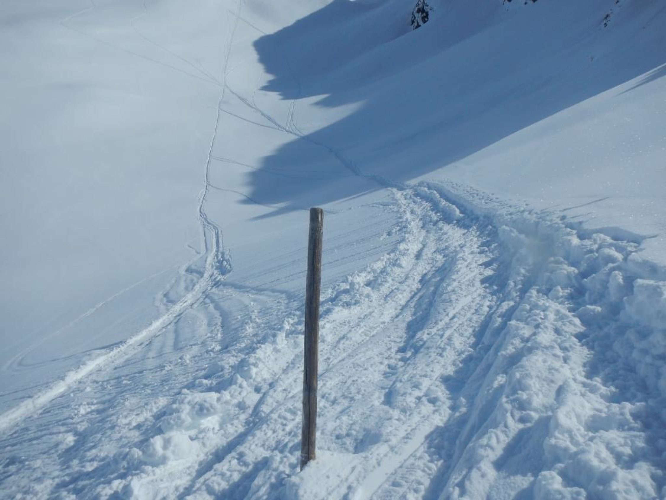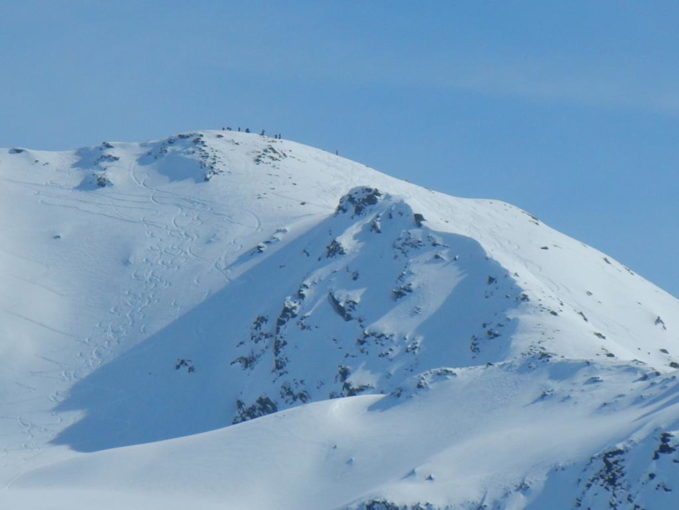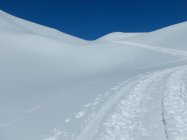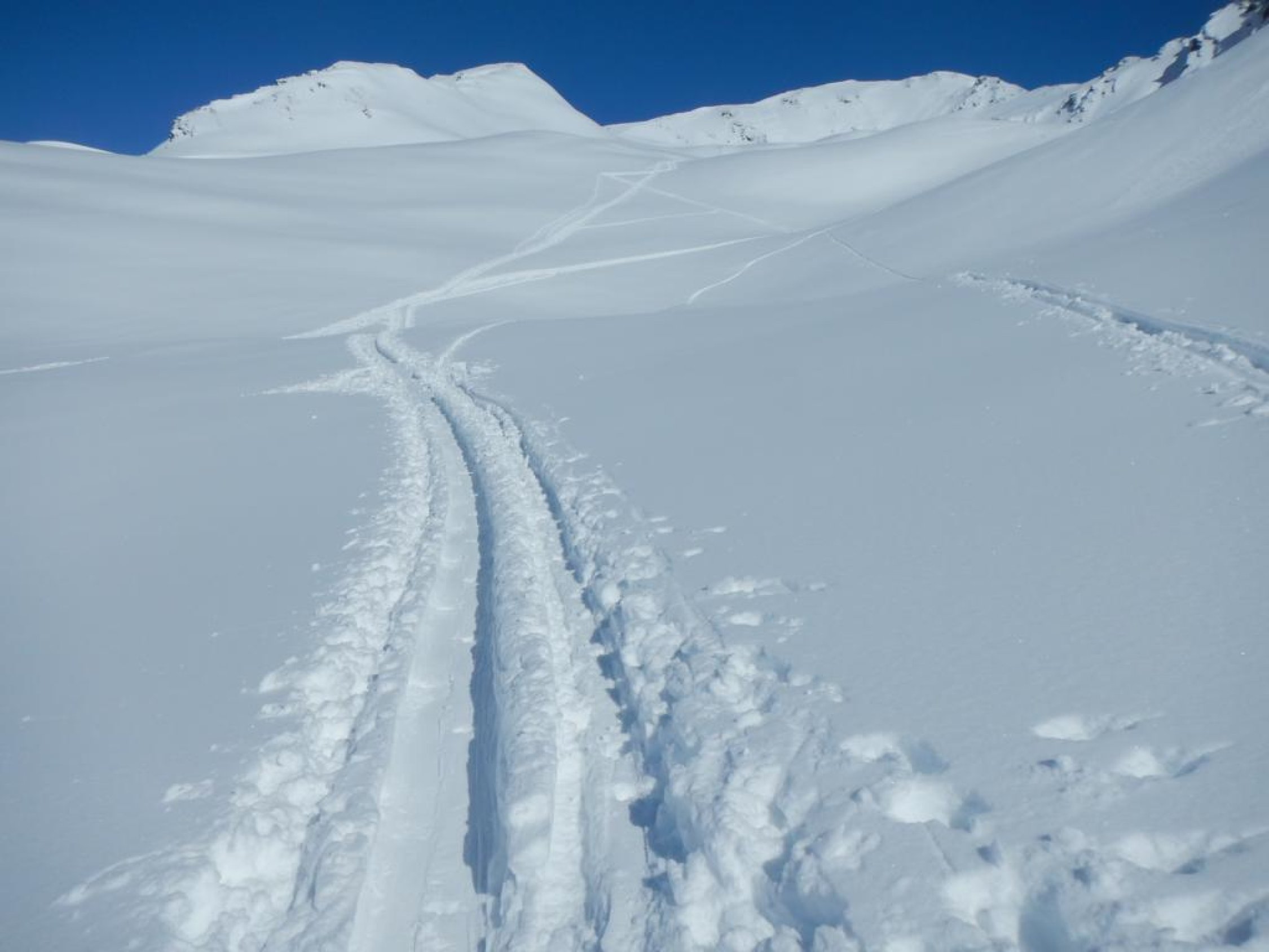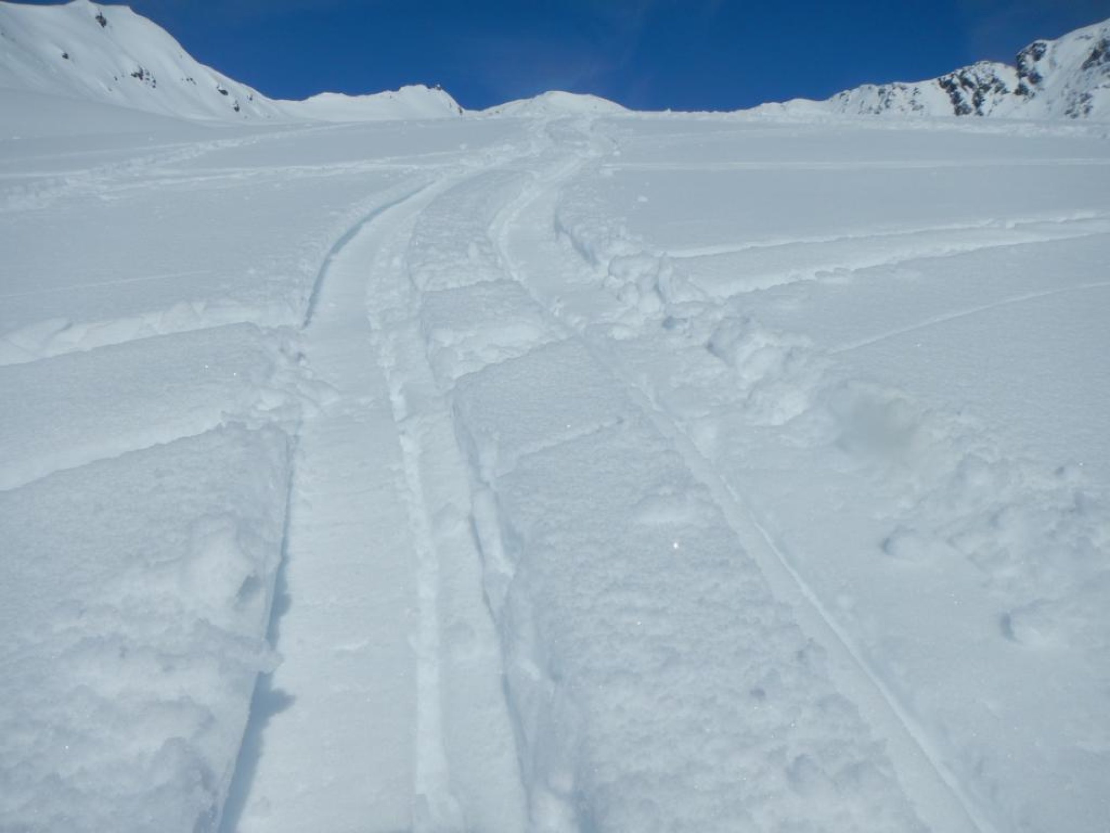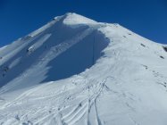 Den ganzen Tag über herrschte Traumwetter. Aufstieg um 10:00. Auf dem Gipfel herrschte schon Gedränge. Kurz steilere Passage bevor man über den Gratrücken problemslos den Gipfel erreicht. Steile Schlittenabfahrt Abfahrt in der Falllinie durch den Gipfelhang, optimalem "Bremsschnee" (ca. 10cm Pulverauflage). Pulver verwandelt sich in Bruchharsch und wird bis zum Flüelapass zu Sulzschnee.