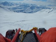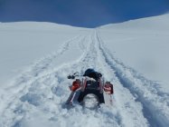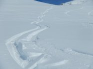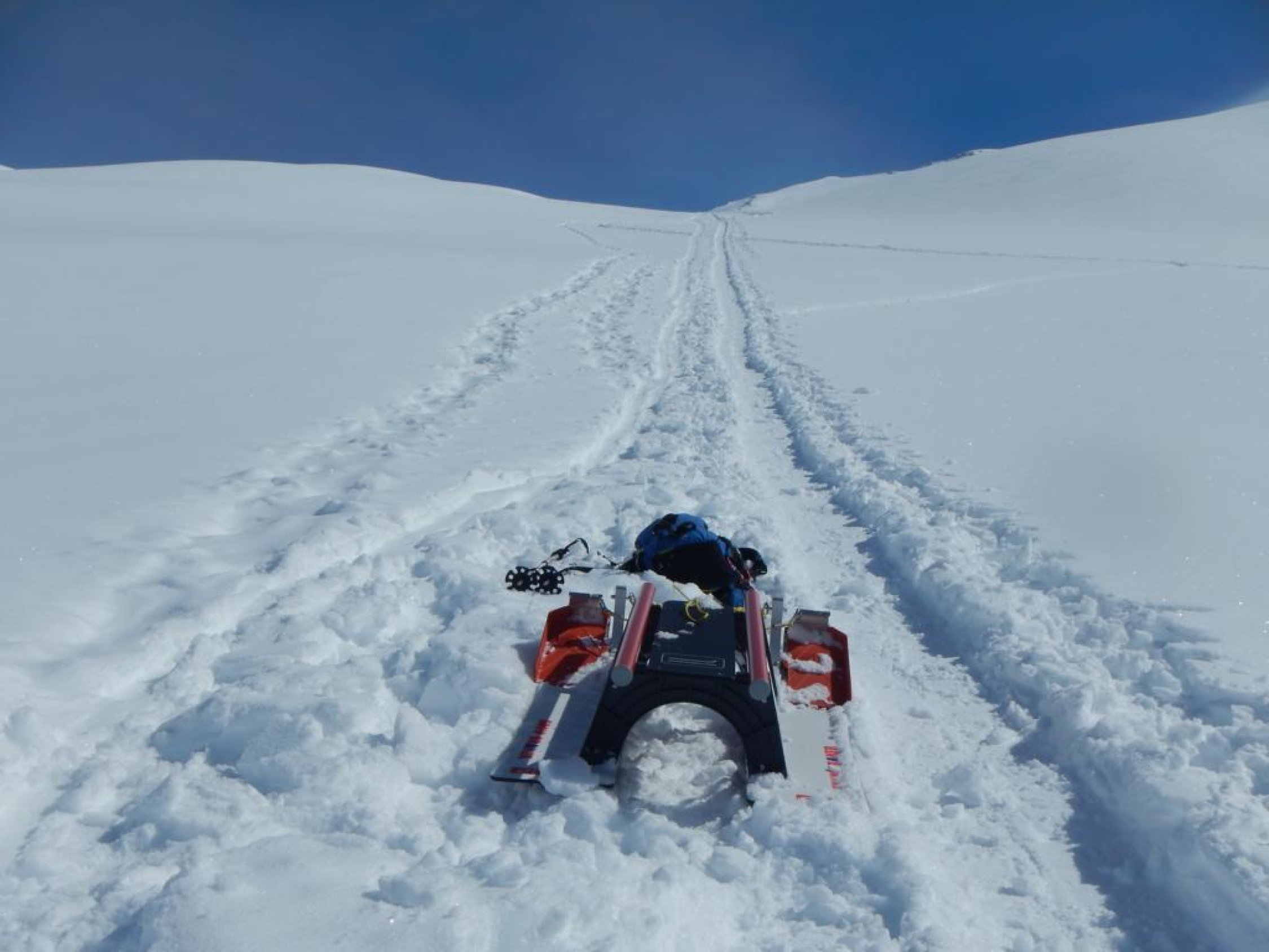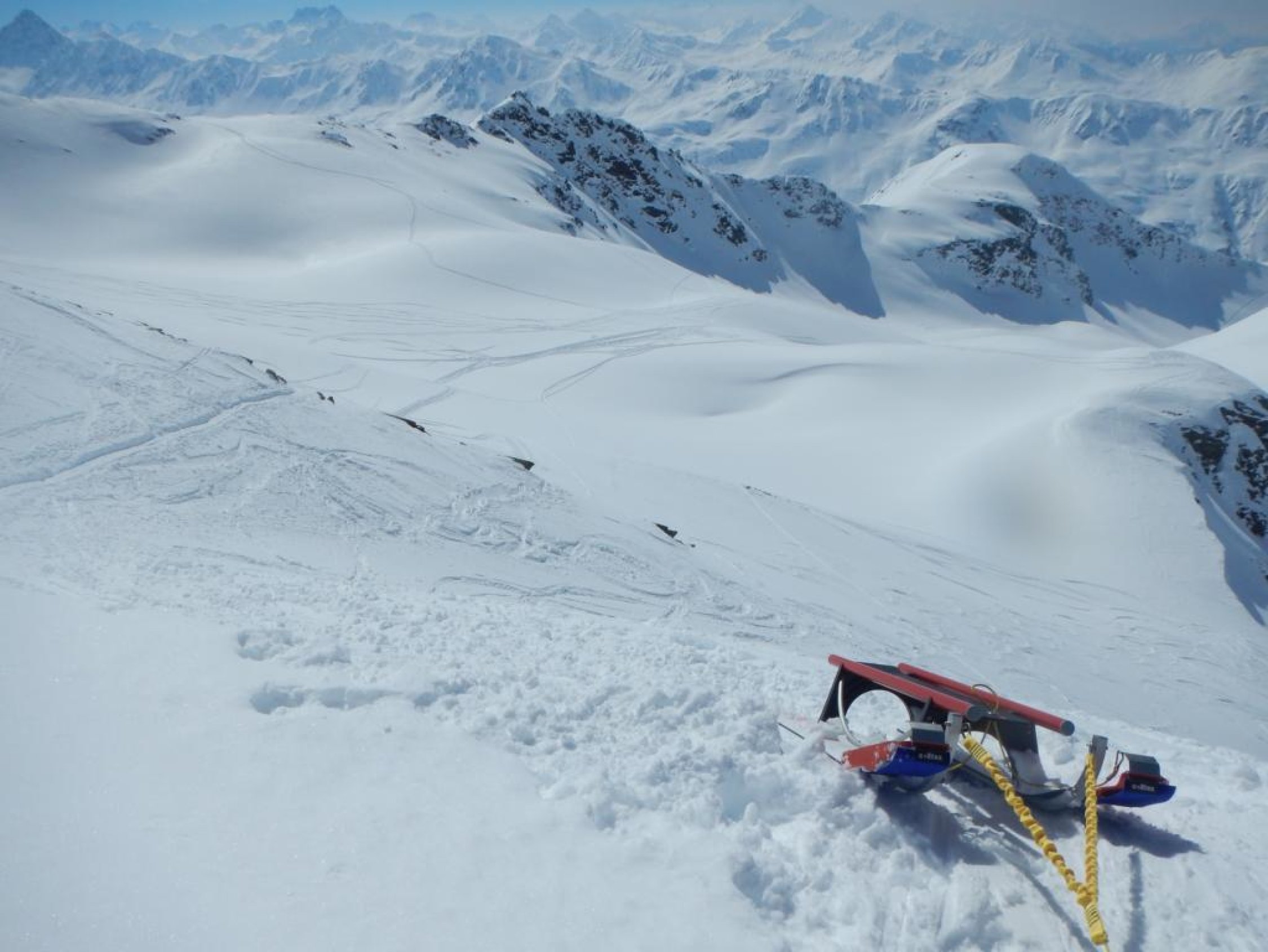 Pionier Schneeschuh/Schlittentour ist immer etwas besonderes. Der Aufstieg ab der Bergstation ist für ich ein wahrer Genuss mit Traumhaften Aussichten. "Leider" komme ich nicht so schnell vorwärts da ich den ALPINEN Tiefschneeschlitten immer wieder den absteigenden Schneeschuhgängern erklären darf. Da die Masse schon abgefahren war befand ich mich nur noch in Gesellschaft von einem Splitboarder und eien Skitourer. Es gab interessante Fachgespräche. Die Startposition auf dem Schlitten mit Blick in das breite Mattjischtälli und die leuchtenden Gipfel bis zum Horizont sind eindrucksvolle Augenblicke. Der ca. 35° steile Gipfelhang stellt eine gewisse Herausforderung dar und ist mit einem gewissen Fahrkönnen problemlos zu befahren. Das geht nicht ohne Adrenalin ! Nun geht es weiter in interessantem Gelände mit abwechselnde Steilstufen und flachen Gleitstücken. Der Schnee wird schon zu weich. Manchmal gibt es auch kurze Gehstrecken. In den den 20° Hängen kann man wunderbar surfen auch bei Bruchharsch!! In etwas steilerem Gelände und geht es kurvend hinunter zur Flüelapassstrasse. 1000HM Abfahrt, es war Genuss pur und ein Abenteuer. Ich habe es für 45 min. genossen. Mir geht es nicht um Geschwindigkeit sondern darum die Berge zu erleben :-), sitzend.