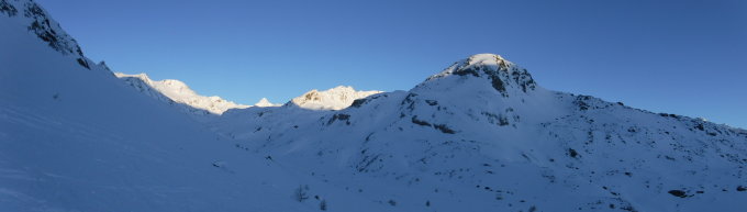 Tourenbeginn ab der Zufallhütte um 05:45 Uhr bei -10°C und ungewohnter Windstille. Die 25 cm Neuschnee der Vortage wurden an vielen Stellen verfrachtet wegen dem Nordwind in den letzten Tagen. Nicht nur wegen der späten Startzeiten wunderte ich mich über die Skitüerler auf der Zufallhütte. Sondern auch darüber, wie und warum Skitüerler ihre eigene Aufstiegsroute entlang der Rechtstraverse über den Gletscherbuckel des Monte Cevedale durch Abfahren wieder zerstören. Die Verhältnisse heute dort oben waren schon ziemlich „abrasiert“. Meine Frage an einige Skitüerler auf der Zufallhütte am Abend, warum man nicht die Aufstiegstraverse für das Abfahren unbehelligt läßt und besser alternativ darüber, oder darunter abfährt, stieß auf Achselzucken.