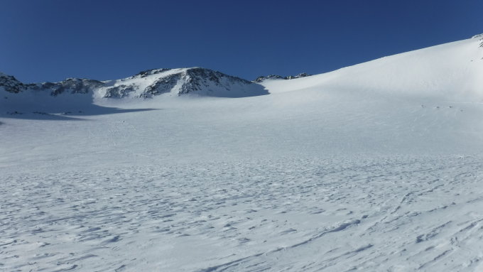 Der Zufallferner wird nie steiler als 26° Neigung. Dort besteht kaum Ausrutsch- und wenig Lawinengefahr. Bei richtiger Routenwahl über die flachen Gletscherrestflächen kommt man nirgendwo mit Spalten in Kontakt, so dass man befürchtungsfrei, seilfrei laufen kann. Oft herrschen zwar sogar aufsteigende „Autobahnspuren“ vor nach 1 oder 2 Schönwettertagen. Jedoch gibt es auch oft genug Wind dort oben, der diese wieder schnell verweht. Interessanterweise fahren dort alle Tourenskifahrer auf diesen Strecken seilfrei ab, selbst jene, die hinauf ein Seil im Aufstieg mit sich durch den Schnee schleiften. Spalten gibt es lediglich an wenigen Stellen an rechtem und linken Rand der Gletscher.