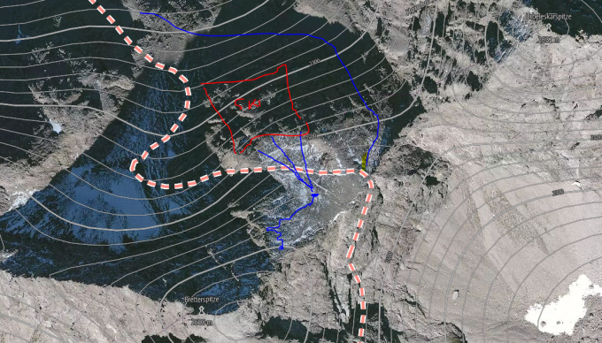 Skiverlust! Leider habe ich meinen selbstgebauten Ski am Gipfel verloren. Diese ist in Richtung des Kaufbeurer-Hauses abgestürzt und über eine Felswand gefallen. (Siehe Bilder)