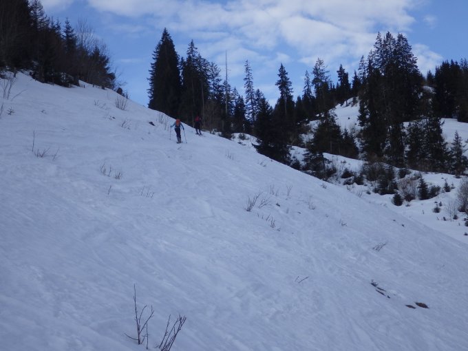 Heute eine ideale Tour, um das Schönwetterfenster auszunutzen. Die Route ist ab PP durchgehend eingeschneit. Spur auf tragender Unterlage bis zum Grat. Ab ca. 1500 leichte Neuschneeauflage. Abfahrt bis ca. Pkt. 1868 Bruchharsch der angenehmeren Art, der sich mit streichelnden Stemmbögen einigermassen gut fahren liess. Dann mehr und mehr tragende Unterlage und ab ca. 1760 Übergang zu feinem Sulz bis zum PP. Zwischendurch nochmals ein Stück weit aufgestiegen und eine weitere schöne Frühjahrsabfahrt genossen.