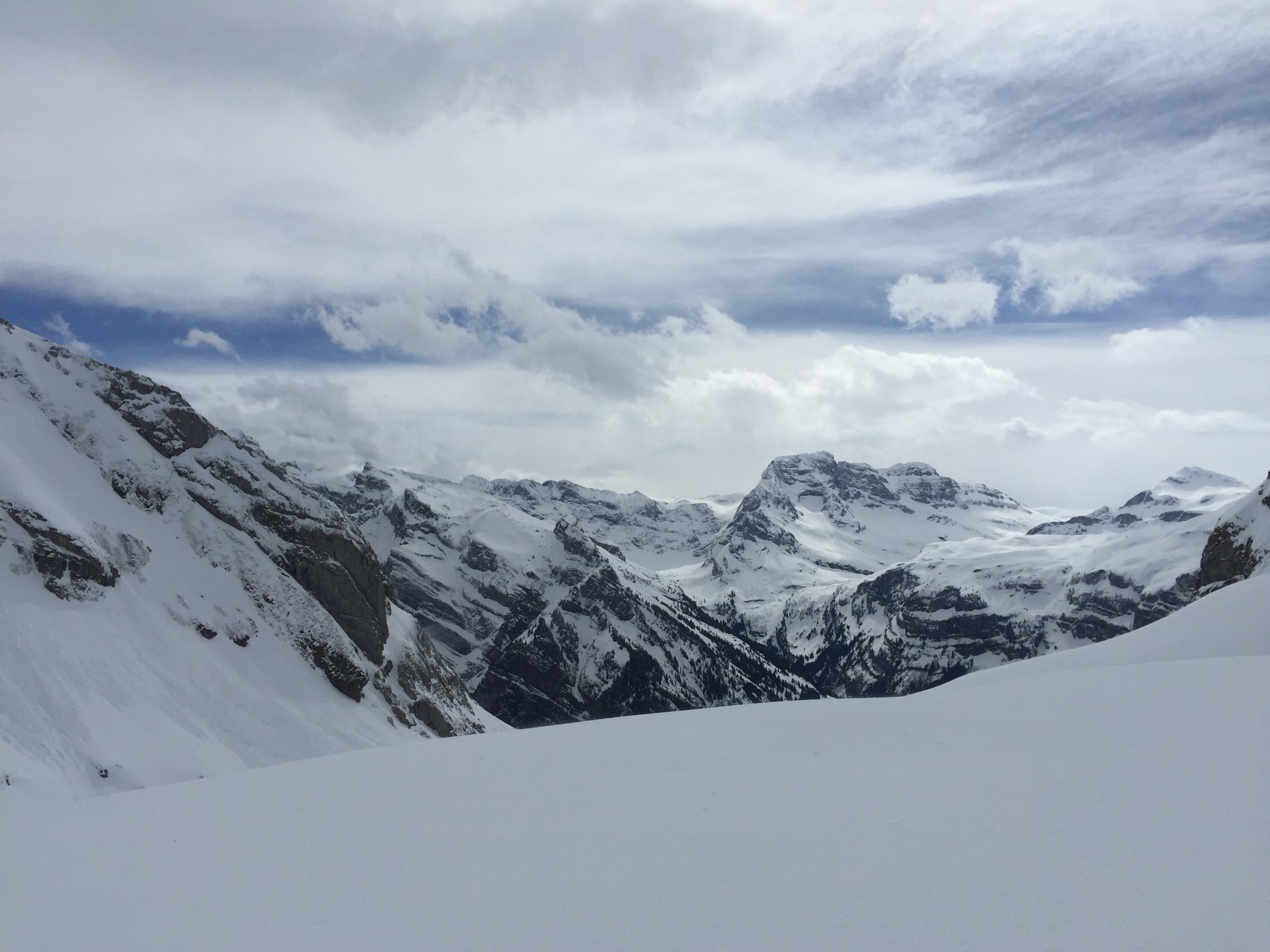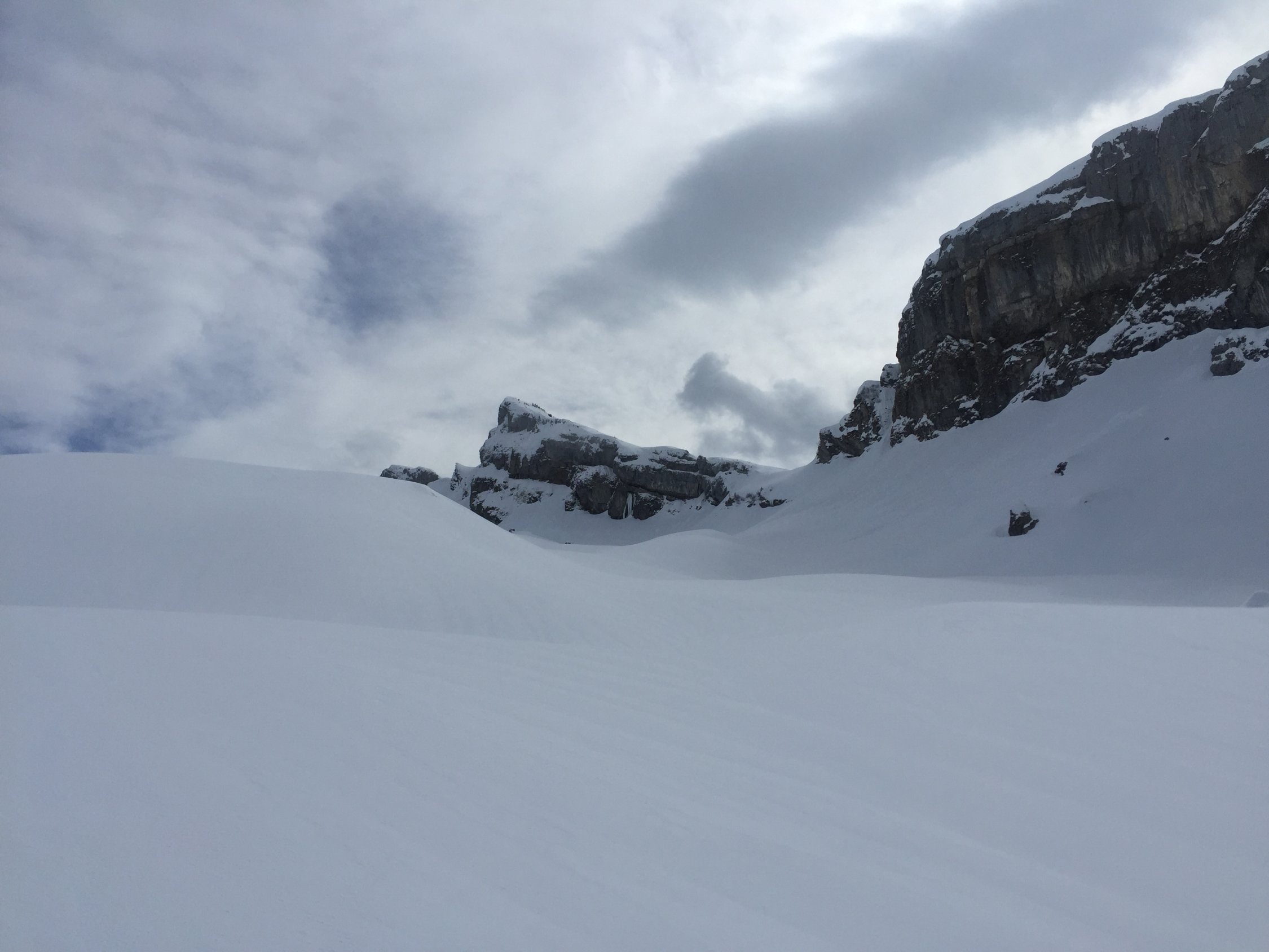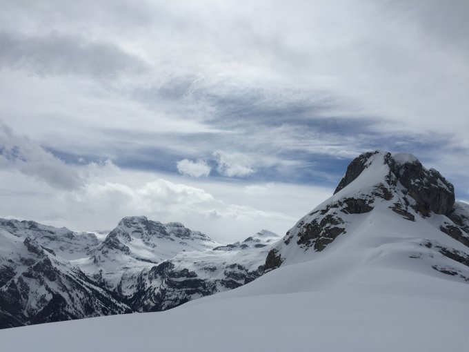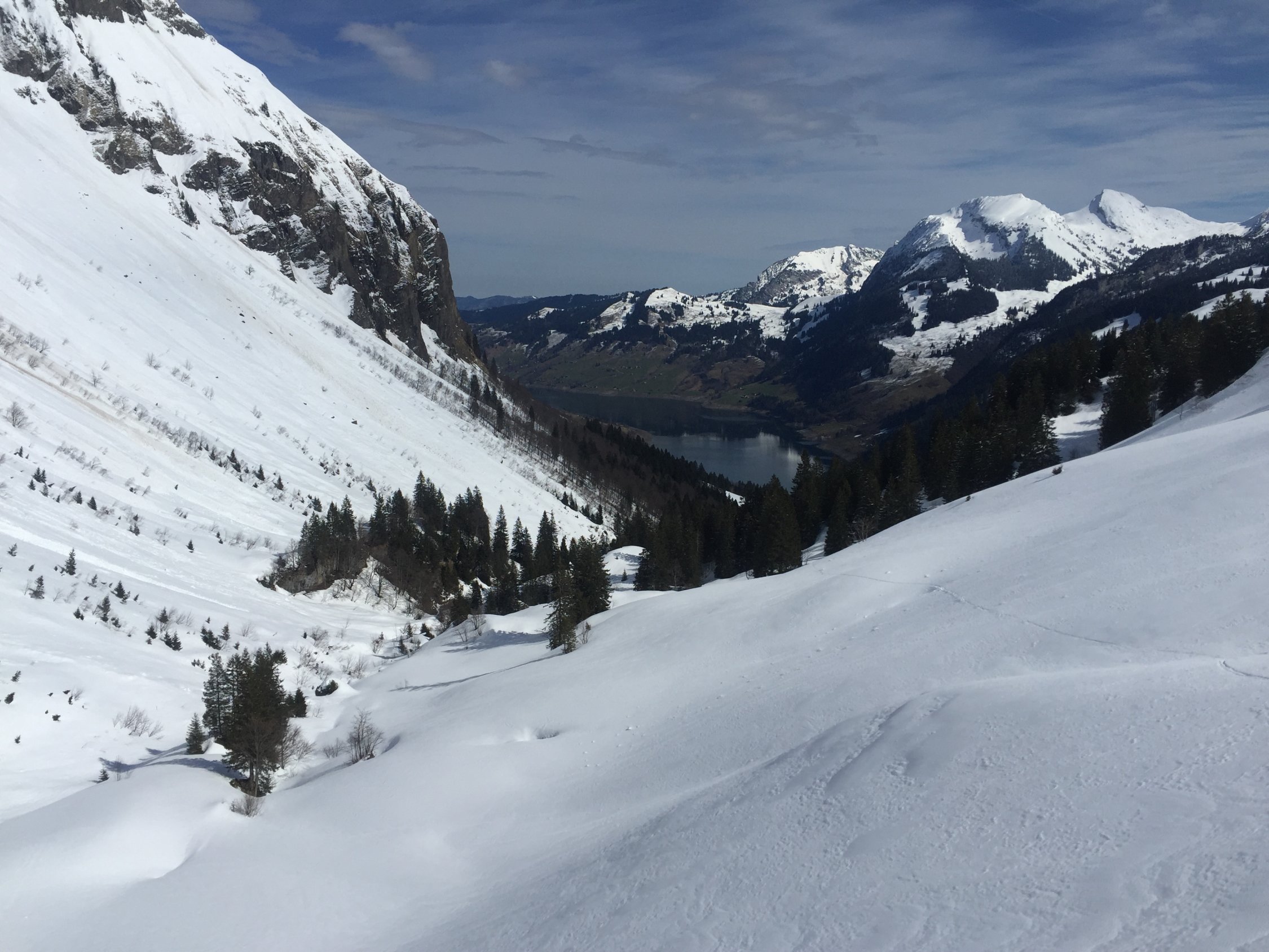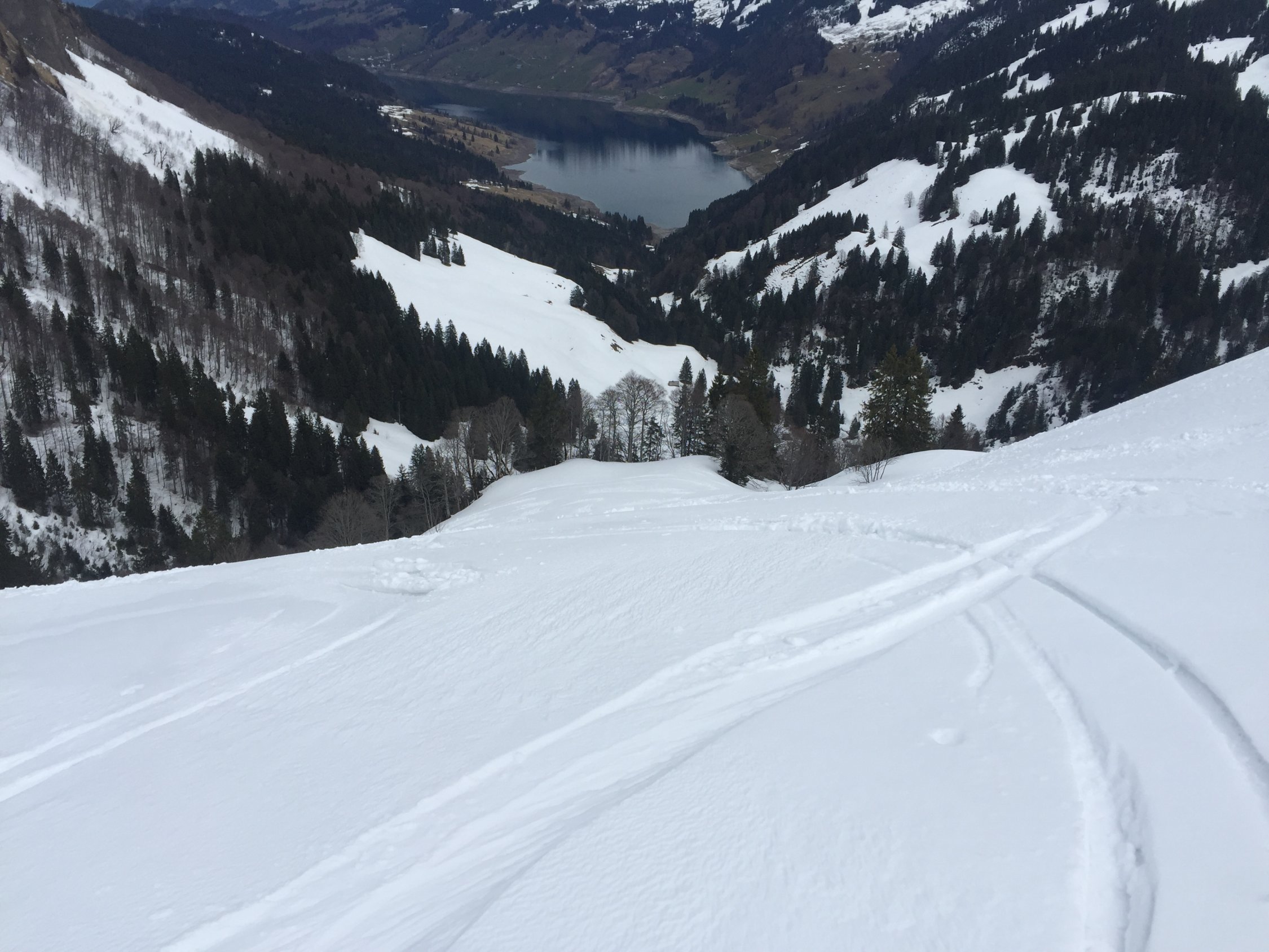 Als ich zum PP am Wägitalersee kam, war der erwartungsgemäss gut besetzt. Wetter bestens, Schnee ab PP, tadellos. Nach meiner Traumtour vor gut zwei Wochen auf den Mutteristock hatte ich heute den Redertengrat im Visier. Ich ging mal bis Aberen, aber dann schien es mir plötzlich reizvoll, halt auch heute am Karfreitag eine einsame Tour zu machen. Also statt links Richtung Rinderweid geradeaus Richtung Schwialppass. Da ist man sofort allein. Im Aufstieg zunächst durch den Wald, dann eine heikle Traverse unter dem Diethelm durch, und zwar in Reichweite, wenn dort was abbricht... Da es am Vormittag noch nicht sehr warm war, konnte man es wagen. Weiter über sehr schönes Gelände zur Oberalp und weiter hoch unter dem Abbruch des Wannegrates. Dann wusste ich nicht, wo abzweigen, weil das erste Mal da, und bin einfach mal hochgestiegen bis zum Pass zwischen Schwalbenchöpf und Wannestöckli. Das war dann auch mein Skigipfel, denn von da aus kommt man nicht gut hoch auf den richtigen Gipfel. Da muss man weiter unten beim Krauter aufsteigen, wie ich jetzt weiss. Oben zeitweise starke Föhnböen, dann wieder windstill. Sicht etwas diesig. Die Abfahrt bot bis Oberalp windgepressten Pulver in tollen Hängen, sehr schön, dann gab es bis oberhalb Aberen so eine Art tiefen Knochenbrecherschnee, und das in einer steilen Waldabfahrt. Ging ok, aber wenn das gefriert, ist es nicht mehr lustig. Von Aberen bis zum Auto guten Sulzschnee.