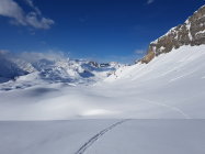 Abfahrt auf der Nordseite ab müssen die Ski schon 30 Minuten getragen werden.