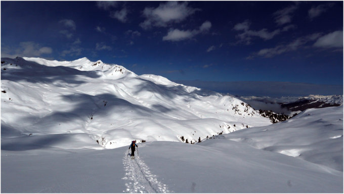 Unten im Tal nur Neuschneespuren, ab Bamberger Hütte etwa 10 - 15cm Neuschnee auf bisweilen nicht tragendem Untergrund. Am Morgen noch pulvrig, gegen Mittag jedoch teilweise schon recht angestochen, trotz nordseitigem Anstieg. Bei der Abfahrt gab es im oberen Bereich einen Mix aus Presspulver, Pulverschnee, später auch schwerem Schnee. NAch dem Gegenanstieg mehrheitlich schwerer, teilweise klebriger aber gut fahrbarer Schnee. Nach der Querung unterhalb des Kröndlbergs insgesamt recht gut zu fahren. Es kann noch problemlos bis zum Parkplatz abgefahren werden.
